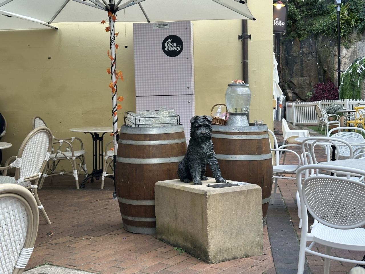 ロックスの一画、週末にはロックスマーケットの市場が並ぶ通りに、「The Tea Cosy」というカフェ・レストランがあります。このお店のテラス席の中に、30センチほどの大きさの、黒いテリア犬の像があります。コンクリートの台座に、お座りの姿勢で通りの方を見つめている、かわいらしい犬の像です。