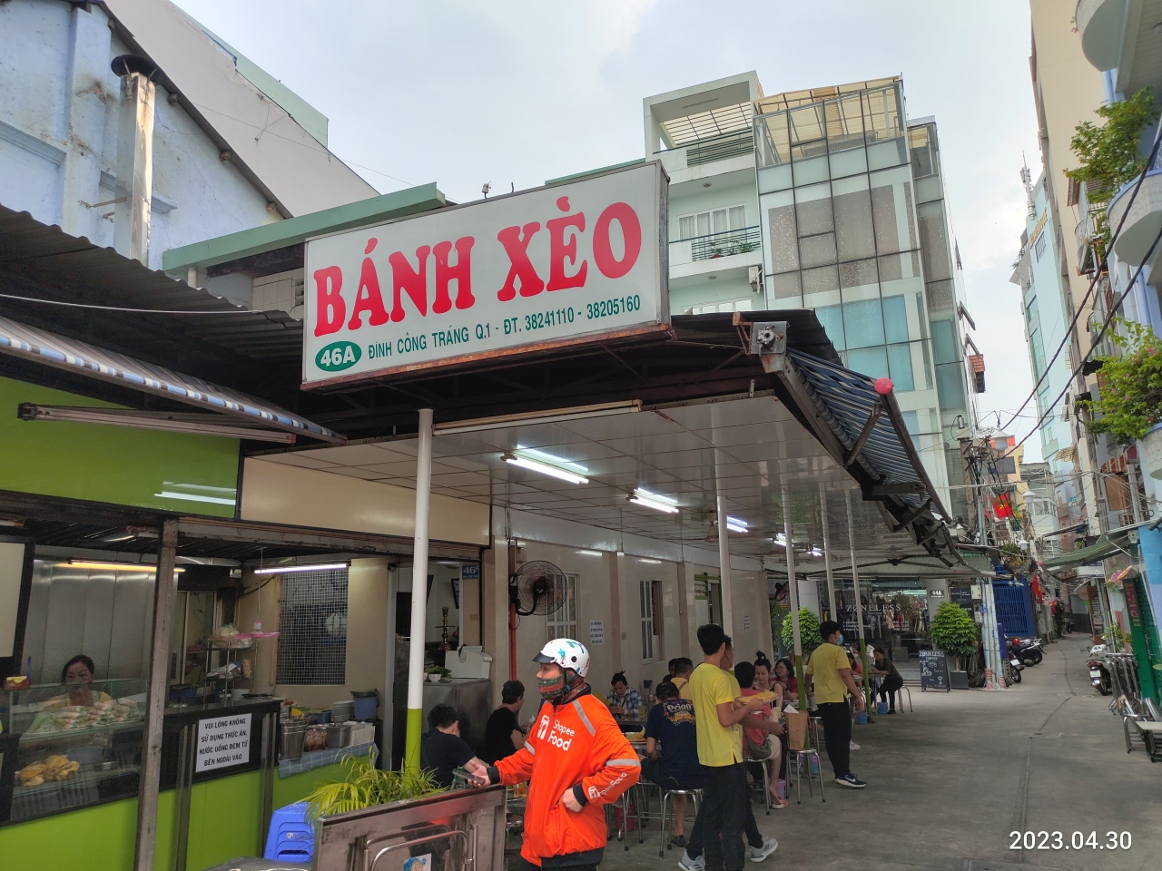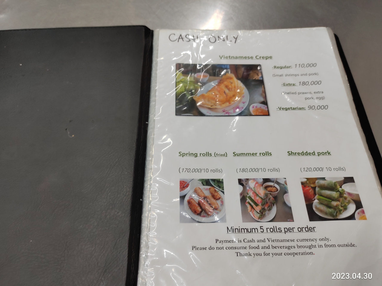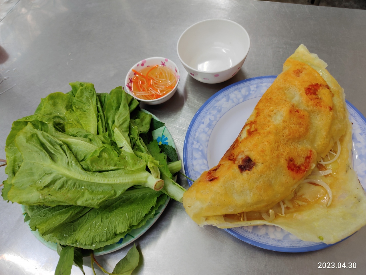 ピンクの外壁が美しいタンディン教会の前の路地を徒歩で3分ほど入ったところにありました。営業時間が10:00~14:00・16:00~となっていたので、16:00過ぎに行きましたが一番奥の席に座れました。当然、バインセオを注文(レギュラーサイズ)もやしやエビを卵で巻いたベトナムのお好み焼きです。エビは殻付きでそのまま調理されているので食べるとき気になりました。支払いは現金のみでした。