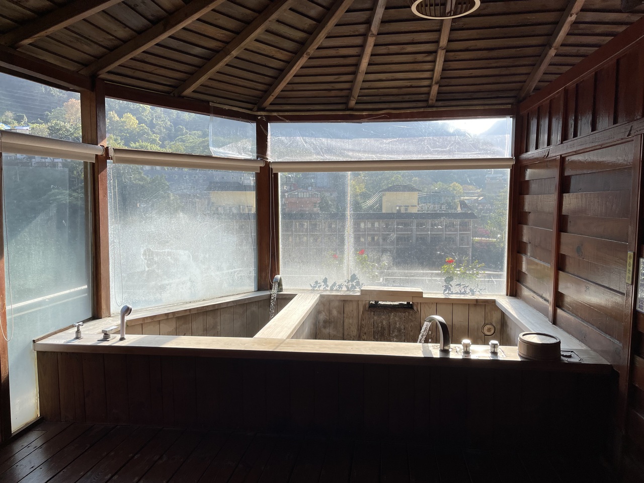 2時間で1000元くらいで、温泉を貸切で楽しめました。水着着用なら200元くらいで大浴場みたいな温泉もあるので、いろいろ探してみるといいと思います。山の中なので、緑が多く、ハチやちょうちょなどの虫も温泉に来てました。