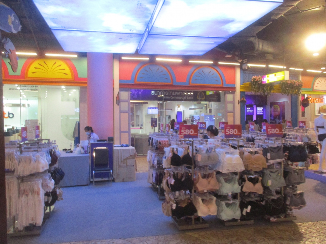 日本ではどちらかと言えば奥のエリアにあるものですが、グルメマーケットの入口に来るといきなり下着売り場がありました。ハウスマヌカンに下着を着せたり、タイの女優さんにモデルをさせて前面に宣伝していました。バンコクで販売されている下着の品質は意外に高かったです。