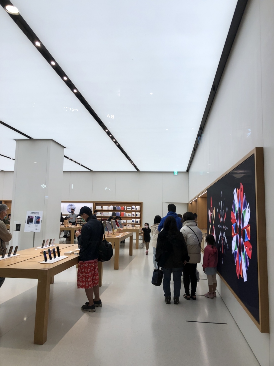 いつ行っても、かなり混んでいます。スタッフの数は、ものすごくいるのに皆忙しそうに動いていました。外観にアップルマークが入っているので、すぐに分かります。他のアップルストアみたいに、新しい製品が並んでいて、充電もできました