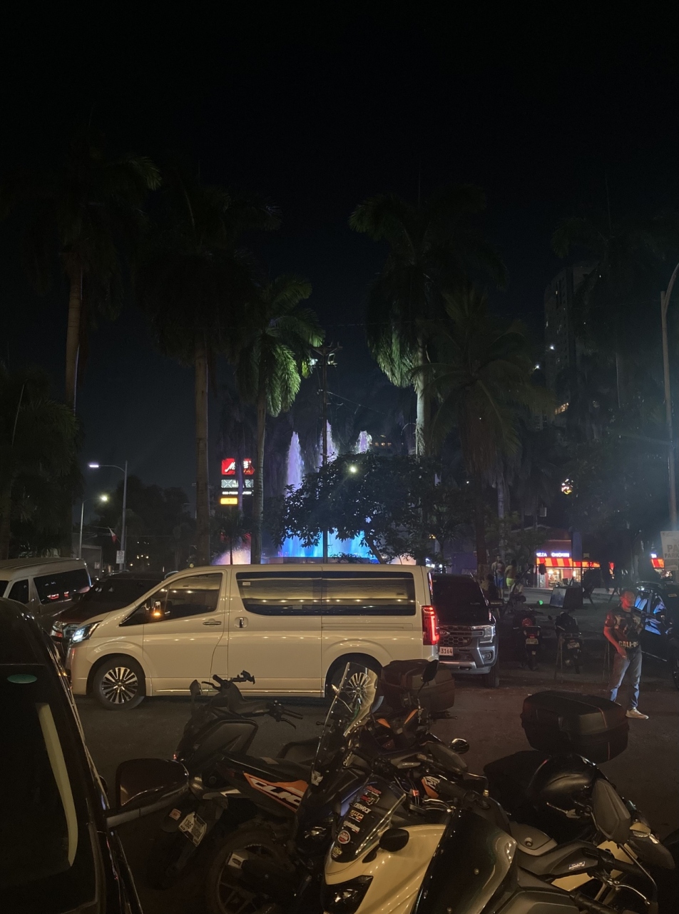 サイドカーに二人、バイクの尻に一人、トライシクルでロハス通りの[アリストクラット]へ晩飯に!