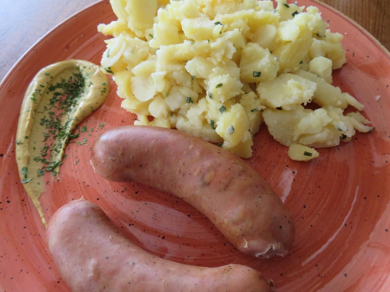 スロベニアの内陸部では、キノコを使った料理やソーセージがおいしいと聞いていたのを思い出しつつ、英語表記もあるメニューを見てみたら、キノコのクリームソース・パスタや茹でソーセージがあったので迷わず注文。