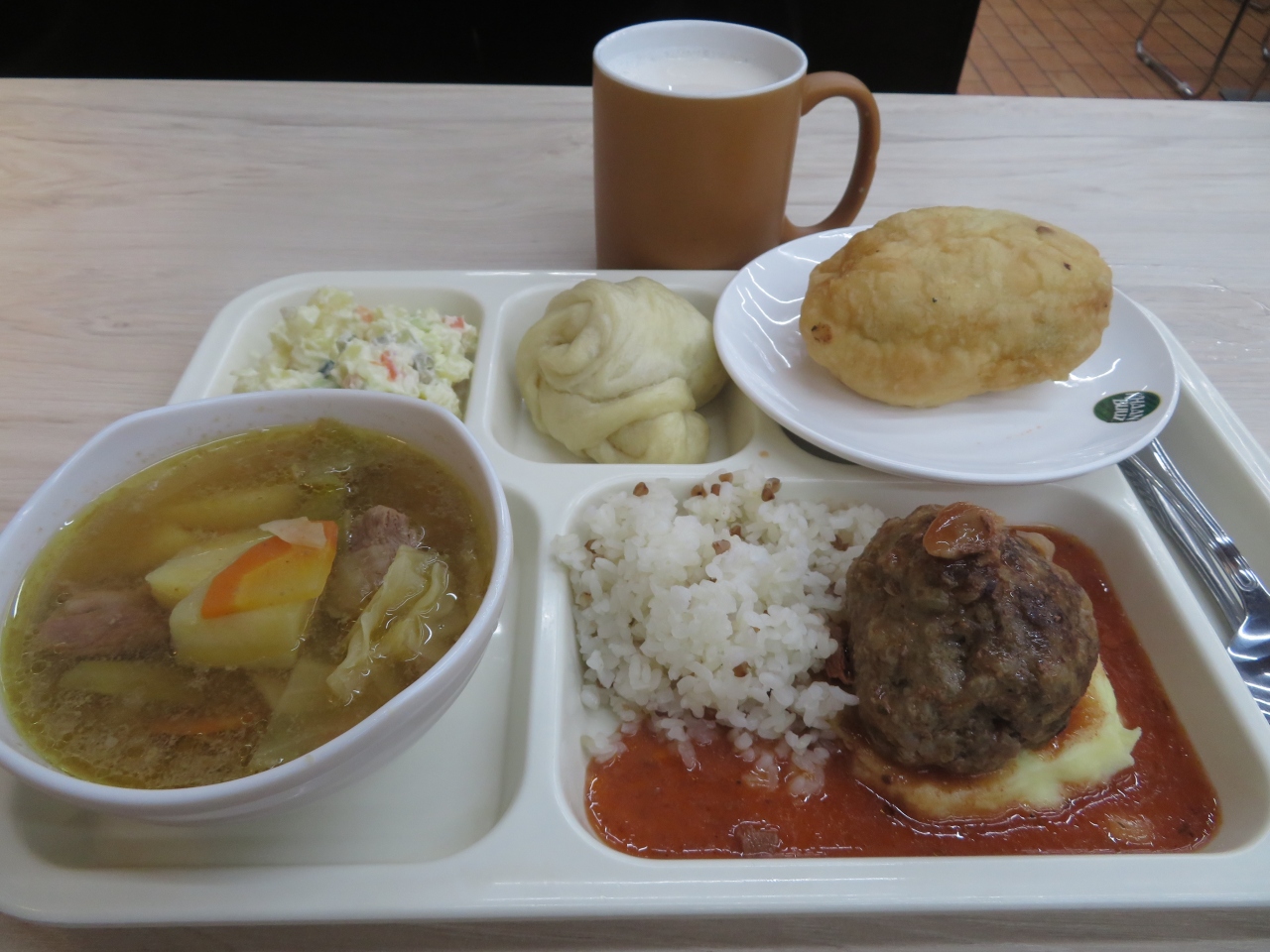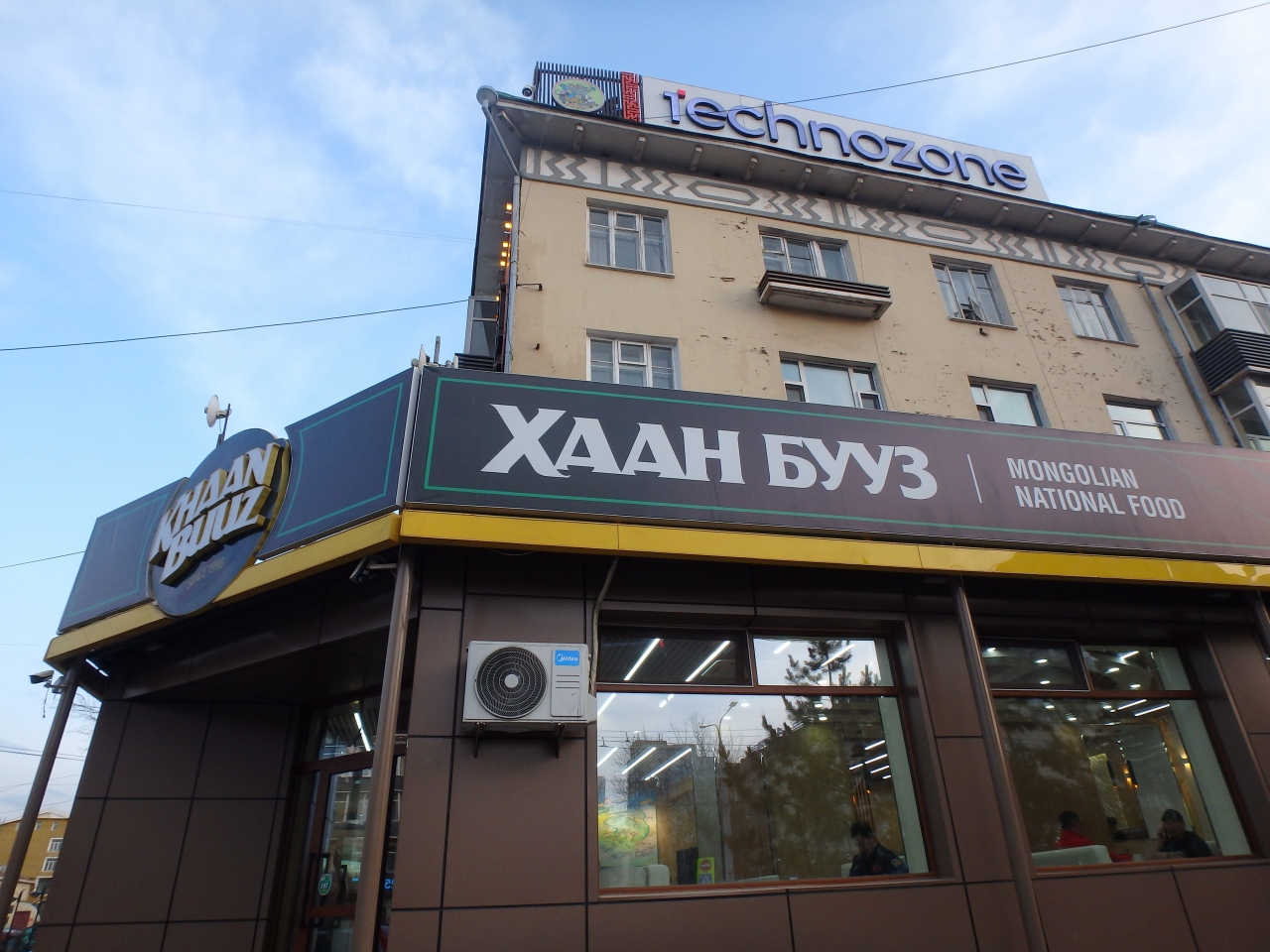 ノミンデパートの道の反対側にあります。モンゴル料理だけでなく、ピザや韓国式海苔巻きなどいろいろなメニューのあるセルフサービスの店です。この店でに肉団子とスープのセットメニュー(12,500トゥグリグ≒500円)とピロシキ(2,500トゥグリグ≒100円)を注文して食べました。注文したい料理をスマホで写真で撮って、店員に見せて注文しました。