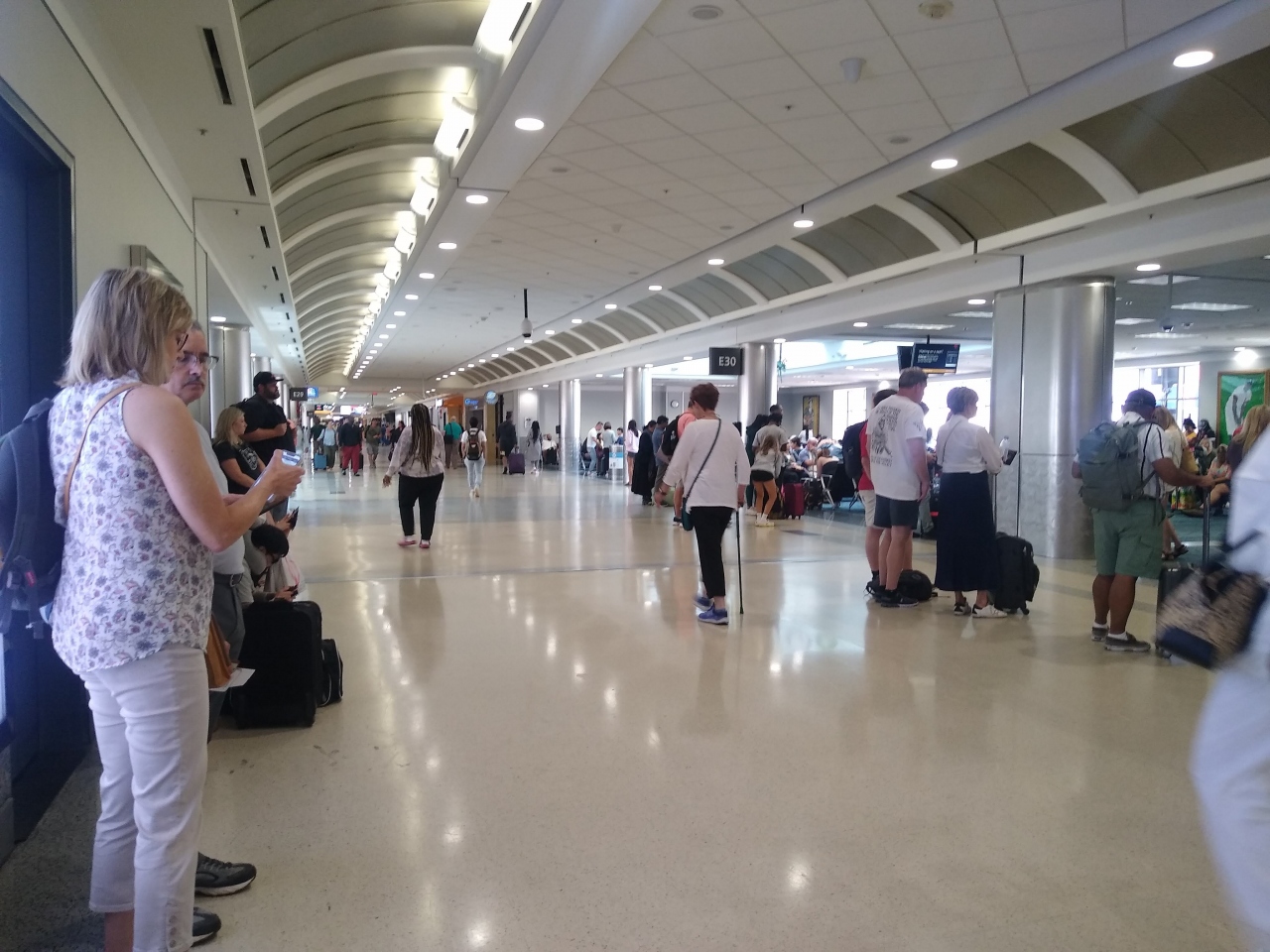 4年ぶりのアトランタ空港。午後4時30分発のアメリカ国内線フライトで、空港着は約1時間30分前の午後3時すぎ。セキュリティ検査は長蛇の列で、列は動いているものの、検査終了まで30分以上かかりました。それから空港内を走る電車と徒歩でゲートまで移動。ゲートについたのは午後3時50分くらい。空港で食事をしようとか買い物を考えているなら時間に余裕をもって到着するほうがいいです。あと、見間違えてなければ、空港内で利用できるカートが9ドルだったと思います。