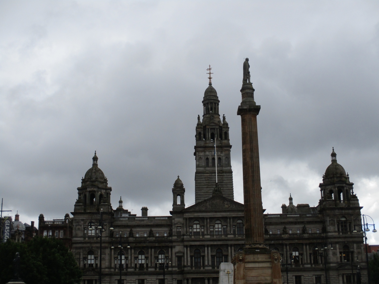 このジョージアスクエアがグラスゴーの中心で、グラスゴー旧市街のランドマークの市庁舎がが正面に建っています。広場の反対側から眺めると、ちょうど市庁舎の中央部分に、背後にグラスゴー大聖堂の尖塔が見えて大迫力です。
