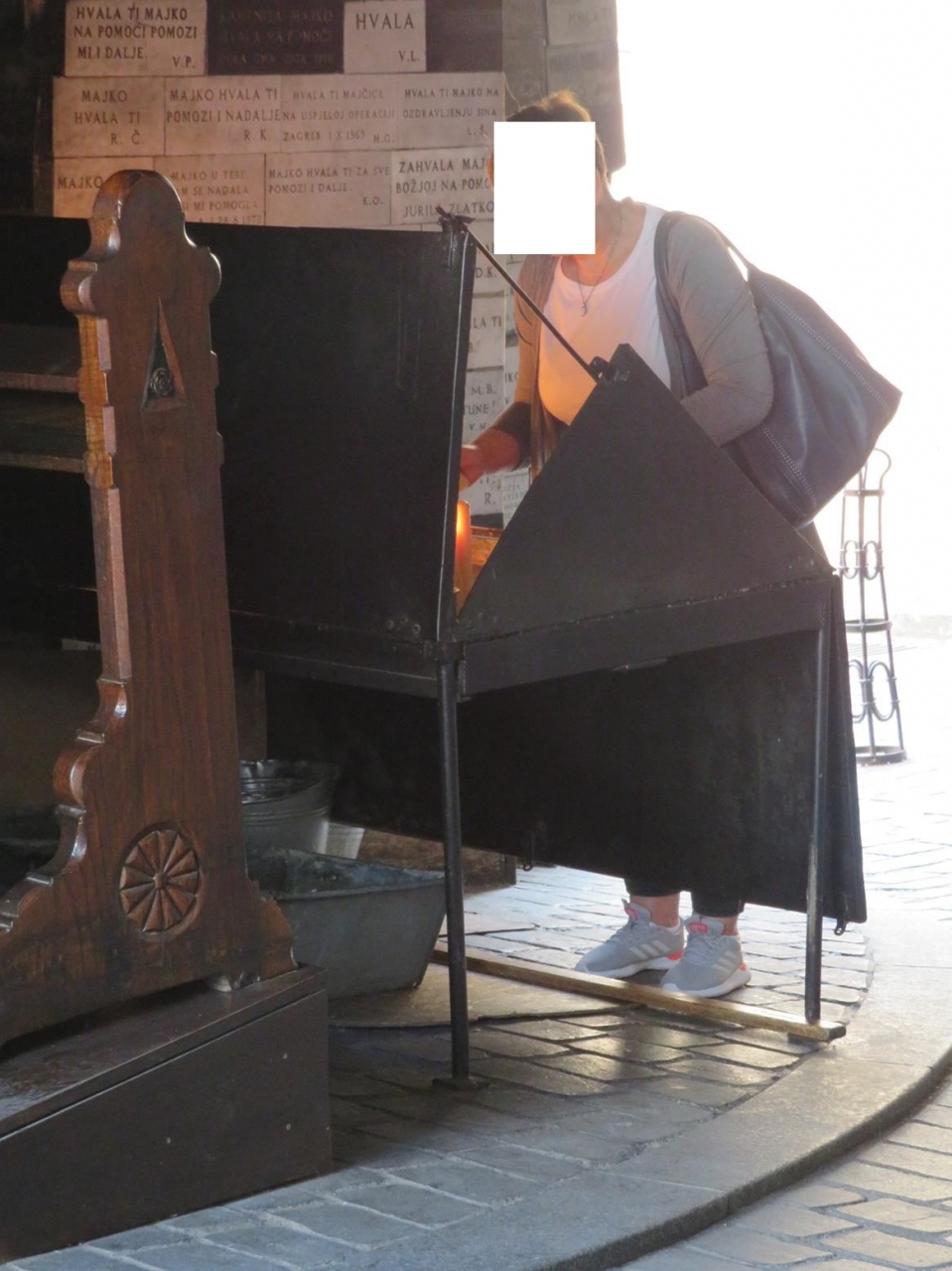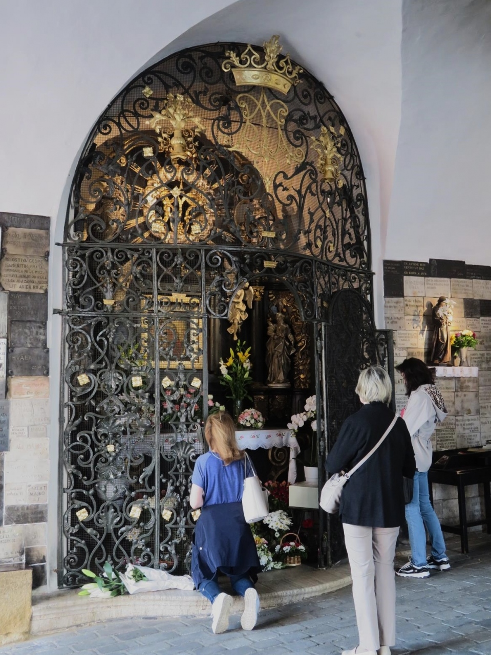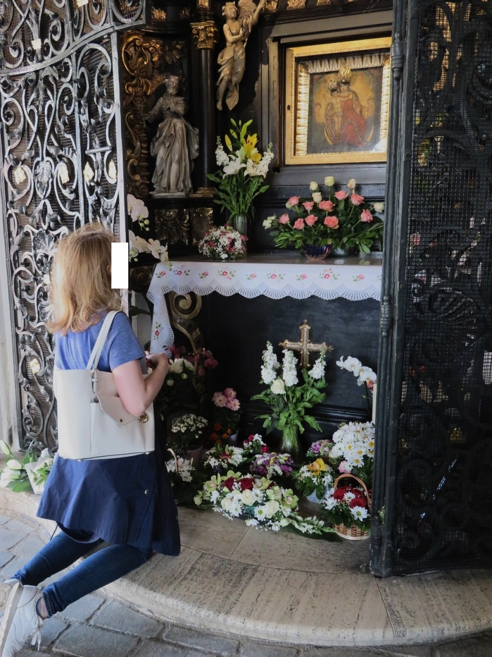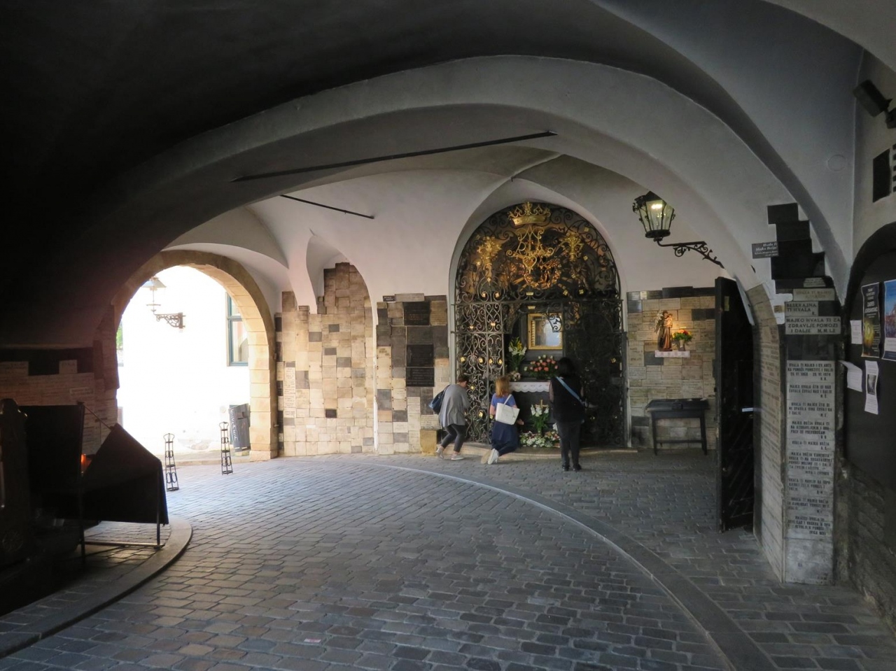 この門は単なる城門ではなく、カーブした短いトンネル状になった内部は聖母マリアを祀った礼拝堂にもなっていて、地元の人々がお祈りにやって来ます。