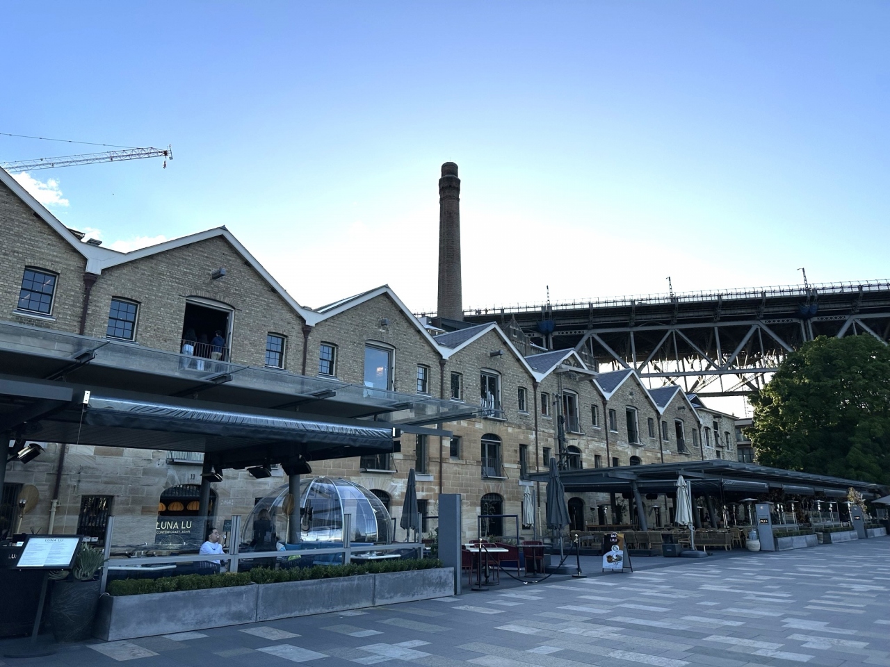 サーキュラーキーの湾を隔ててオペラハウスが正面に見えるところ、岸壁に沿って10軒の三角屋根の建物が並んでいます。19世紀、イギリスによるロックスの開拓期に建てられた倉庫群の跡で、スコットランド商人のキャンベル氏の所有であったことから、キャンベルズ・ストアハウスと呼ばれています。