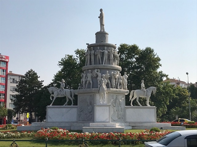 トルコで若者に人気の高い街のエスキシェヒルへ行きました。アンカラからYHTという高速鉄道で約1時間ぐらいで到着しました。駅から宿泊するイビスホテルへ歩いて行く途中のロータリーの真ん中に、この肖像画ありました。トルコ建国の父のアタチュルクが一番上に立っていて、とても立派です。