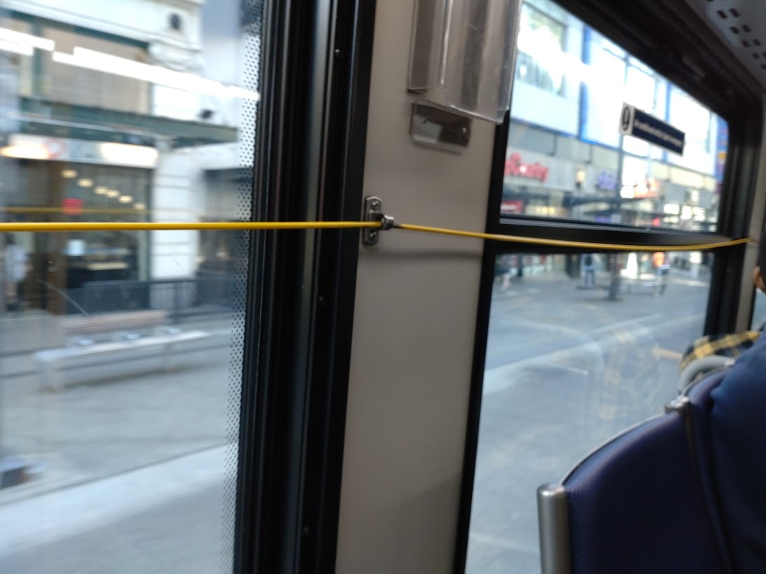 料金は区間に寄らず市内均一で乗るときにコンパスカードをタップすればよいだけ。降りたいバス停が近づいたら、窓側に張られた黄色(車両によってはシルバー)のワイヤーを引っ張って運転手に知らせる仕組みが独特で面白かったです。通路側のポールには押しボタンが付いていましたが、ワイヤーを引っ張って「スコン!」と音が鳴るとわかったら自分もやってみたくなりました。