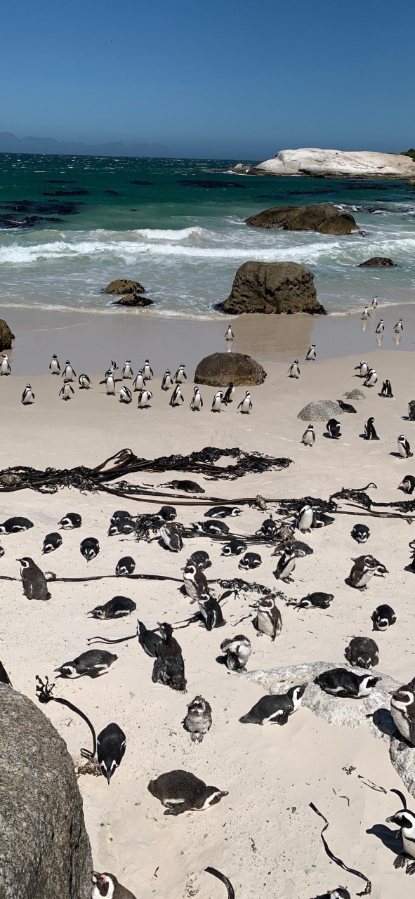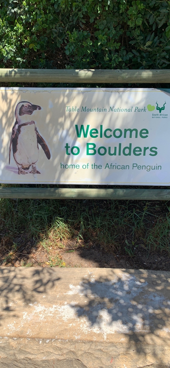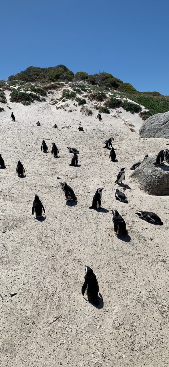 喜望峰からボルダーズビーチへ移動して遅めのランチ&ペンギンツアーとなりました。バス駐車場から少し歩いて遊歩道入口ゲートへ到着。ビーチへと続く遊歩道を進んでいくとケープペンギンの群れが見えてきます。天気は良かったのですが海からの風がとても強く、巻き上げられた砂が全身に叩きつけてきて痛かった。それでも野生のペンギンを間近で観察できてよかったです