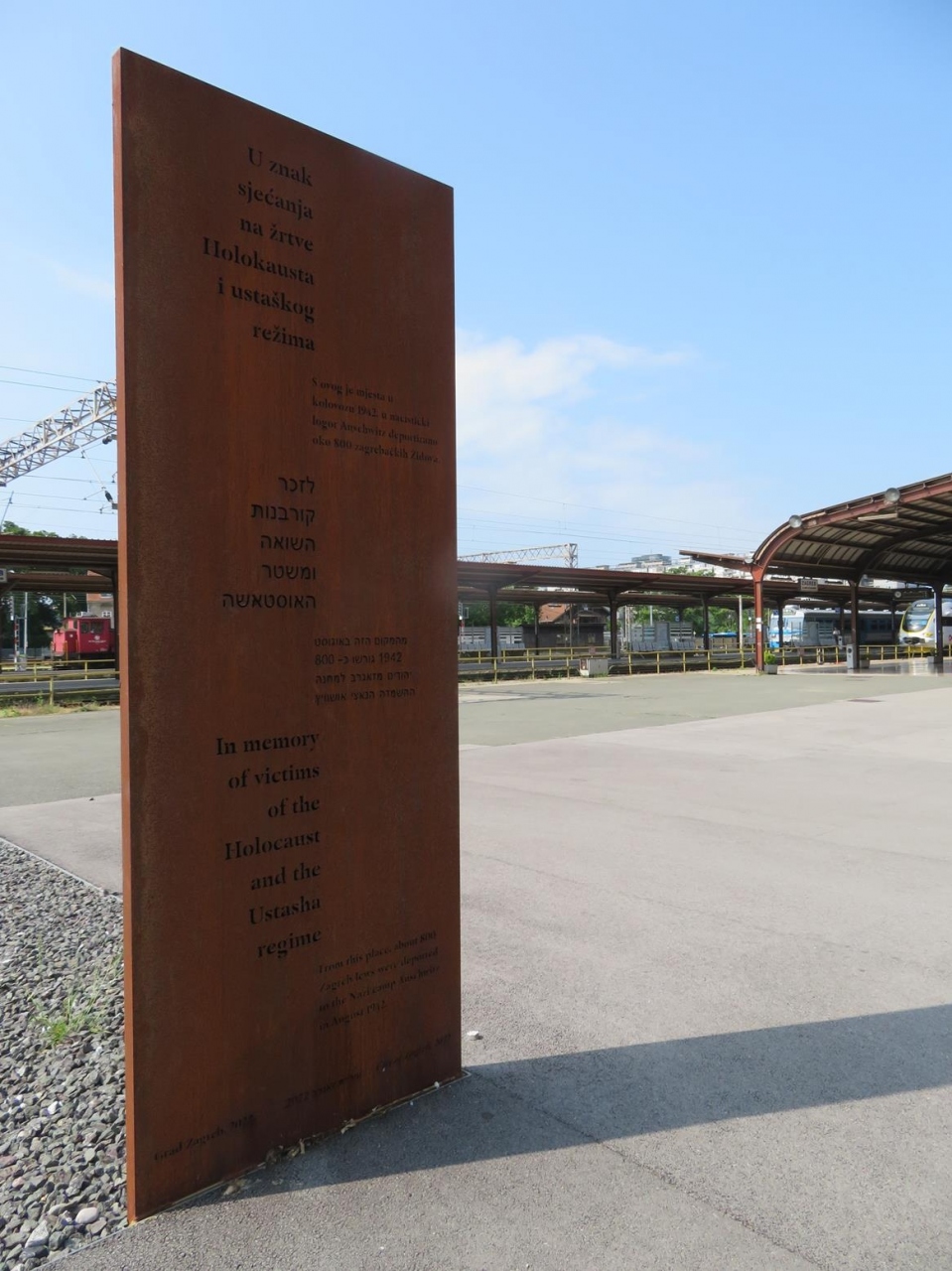特筆したいのは、駅舎正面に向かって左手の端には、1891年製造(?)の機関車や、1942年の8月にはここからザグレブのユダヤ人800人ほどがアウシュビッツに送られたと記された歴史モニュメントもあったこと。
