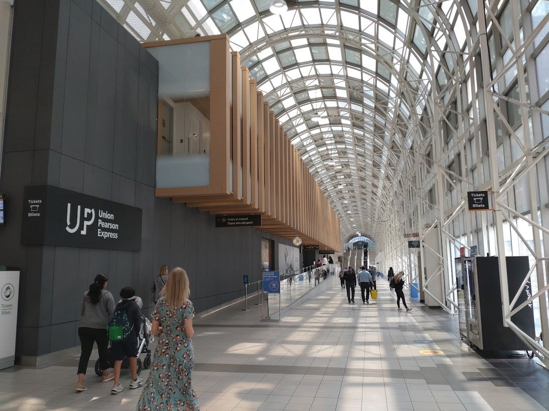 UPエクスプレスに乗って到着したユニオン駅は、従来からの駅舎の西側、CNタワー寄りにありました。そこからメトロがある東側へ向かうとグレートホールの案内板が出てきたので入ってみました。足を踏み入れた瞬間、天井の高い巨大な空間に圧倒されます。街の表玄関にふさわしい堂々としたホールでした。
