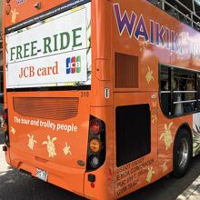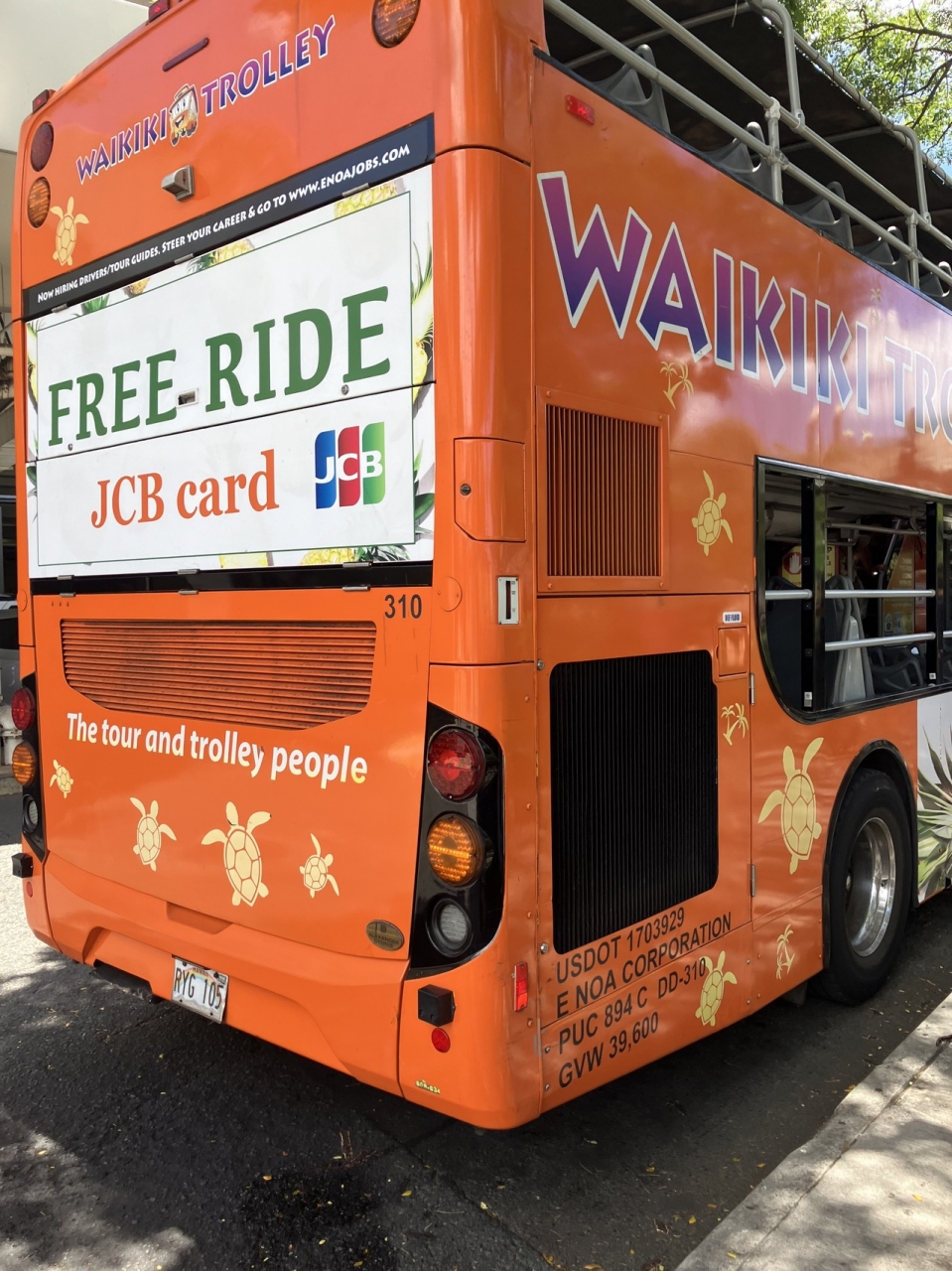 ワイキキ中心部からアラモアナセンターまで利用しました。2階建てのバスです。JCBカードを提示すると無料で乗車することができます。