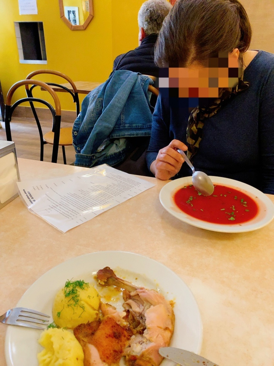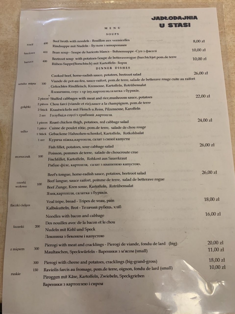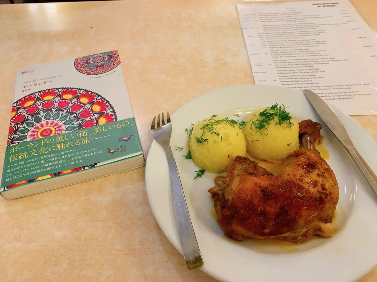 ガイドブックに載っていたメニューの、ローストチキンとマッシュポテトを注文しました。 これに、赤キャベツのサラダ(酢漬け)がついて24PLNでした。 ヨーロッパ旅行で外食して800円程度で食事できるって、ポーランドはなんて物価が安いんでしょう?!と驚きました。
