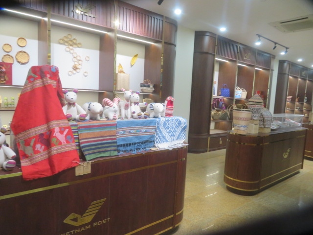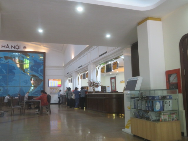 ハノイ市街、ホアンキエム湖の湖畔東側、ディンテイエンホアン通り沿いにあります、リー・タイトー公園から行きました、大きな建物で分かりやすいです、建物前に黄色の郵便ポストがあります、建物内には椅子・テーブルがあり、そこで手紙を書くことができます、記念になりそうな物も販売されていました。