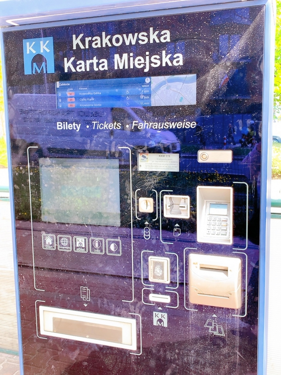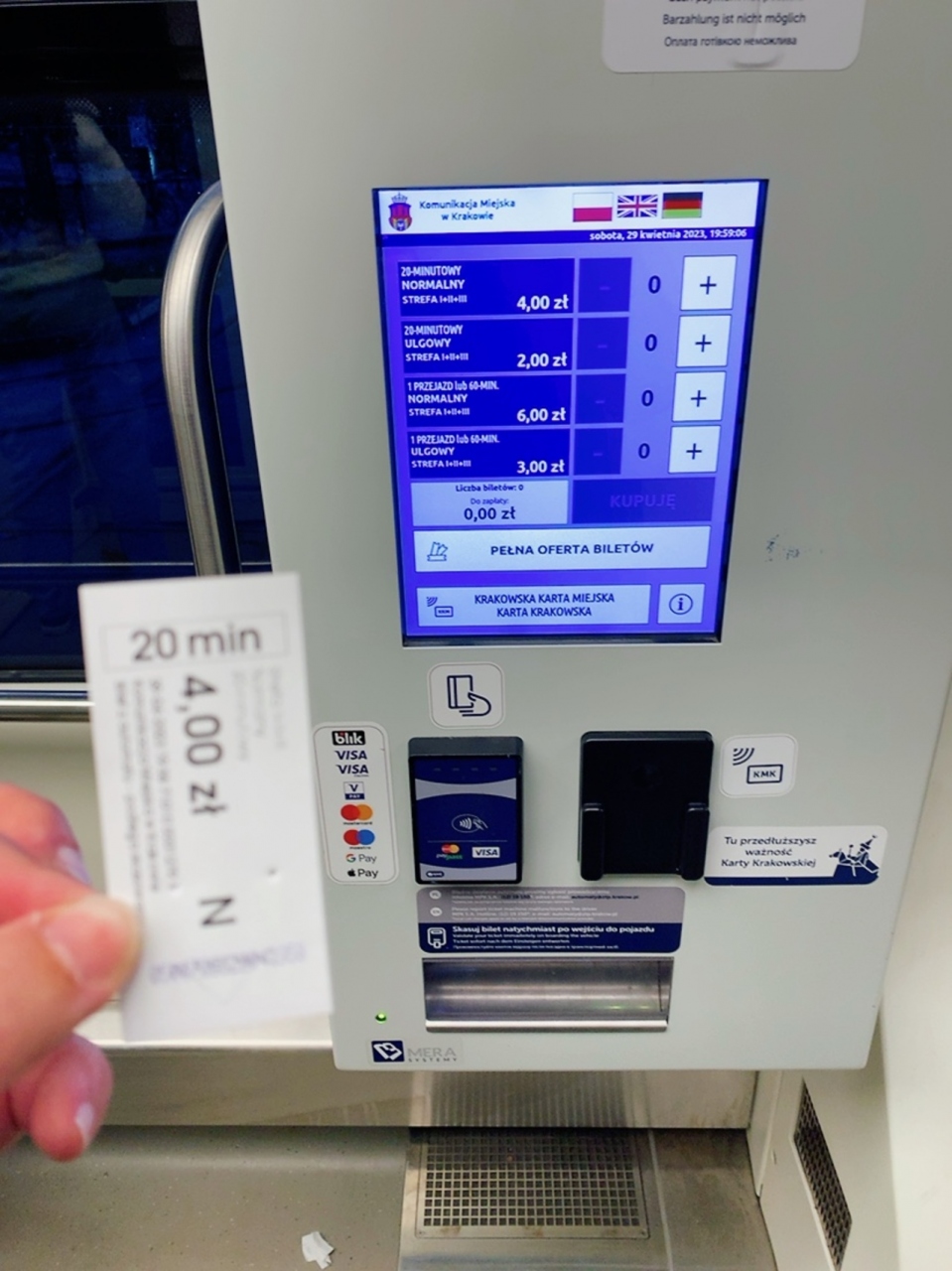 きっぷの券売機は大きな電停なら設置してあると思います。 車内にもありましたが、車内で買う場合は硬貨とタッチ決済の出来るクレジットカードしか使えませんのでご注意ください。 トラムに関わらず、ポーランドは100円くらいの支払いからカード支払いが出来、クレジットもタッチ決済が主流になっているようなので、Visaタッチなどのタッチ決済の出来るカードを1枚持って行けば便利です。