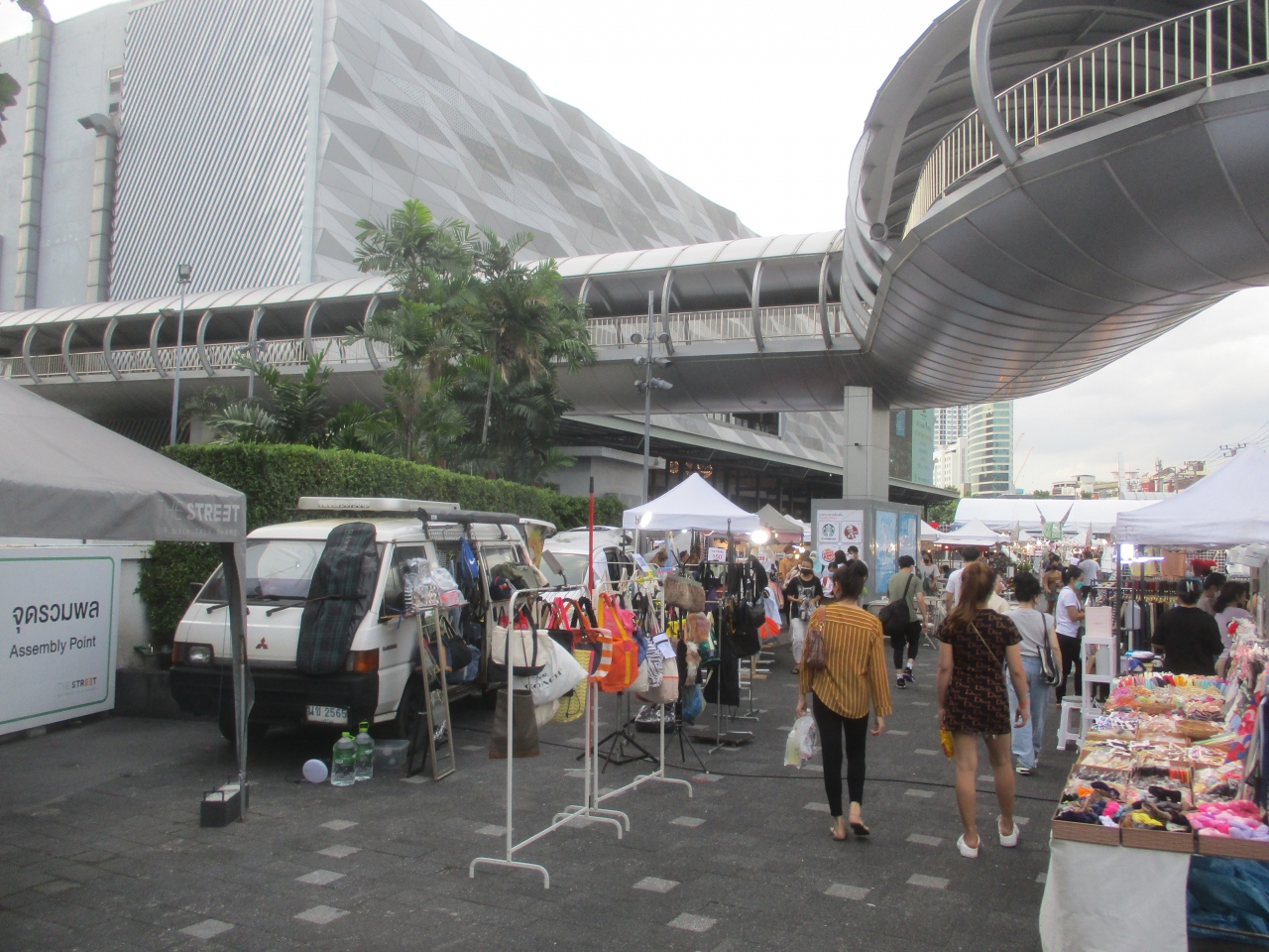 ラチャダーピセーク通りを歩いていると、大きい音楽とおいしそうな匂いが漂っていました。昼間から旨いチムチュムとイサーン料理が食べられる屋台が並んでいました。暑さを忘れ外での立ち食いと、タイ土産に雑貨のショッピングを楽しめました。