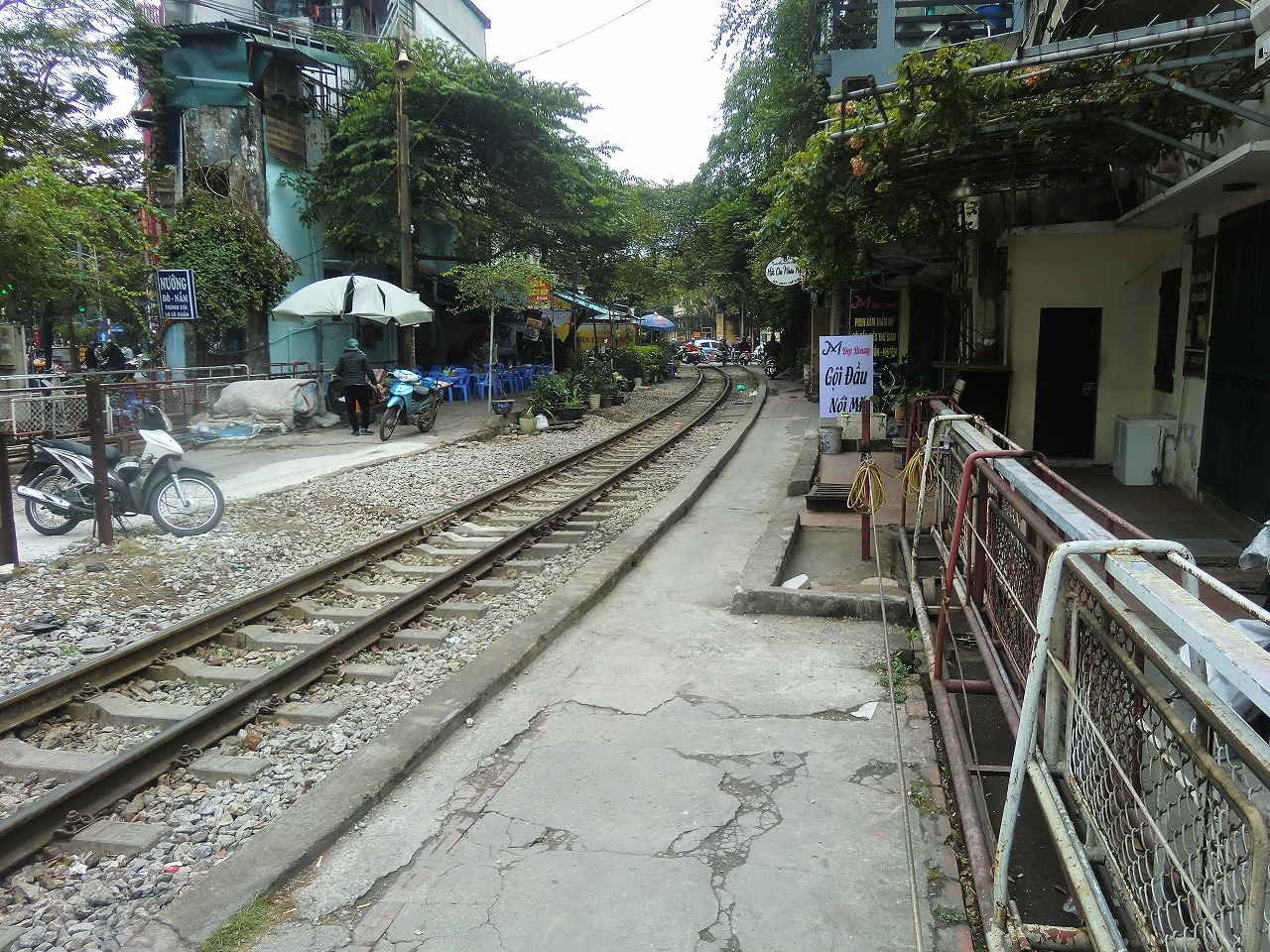 ハノイのハノイ駅近くにある線路沿いにカフェが集合しているエリアです。