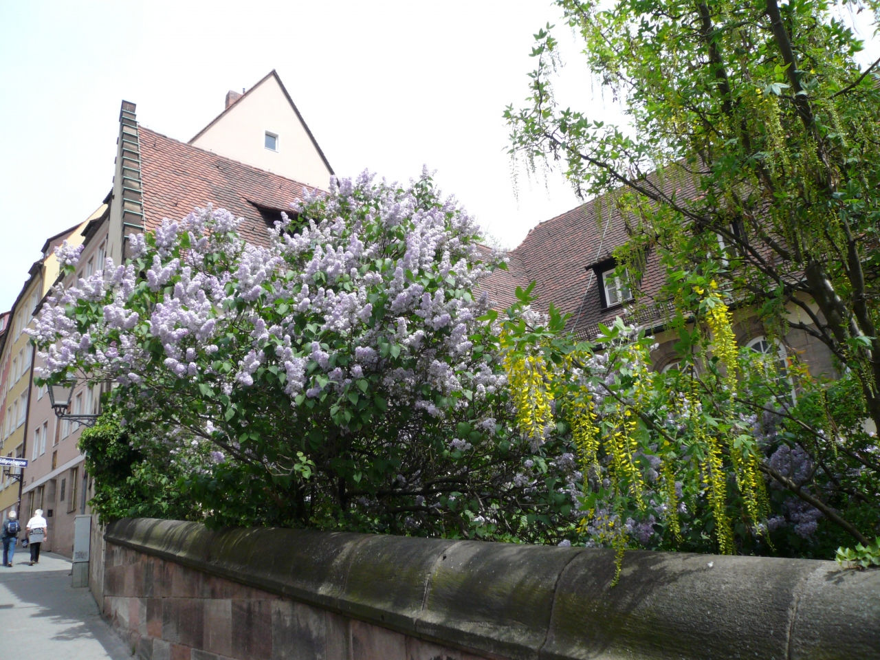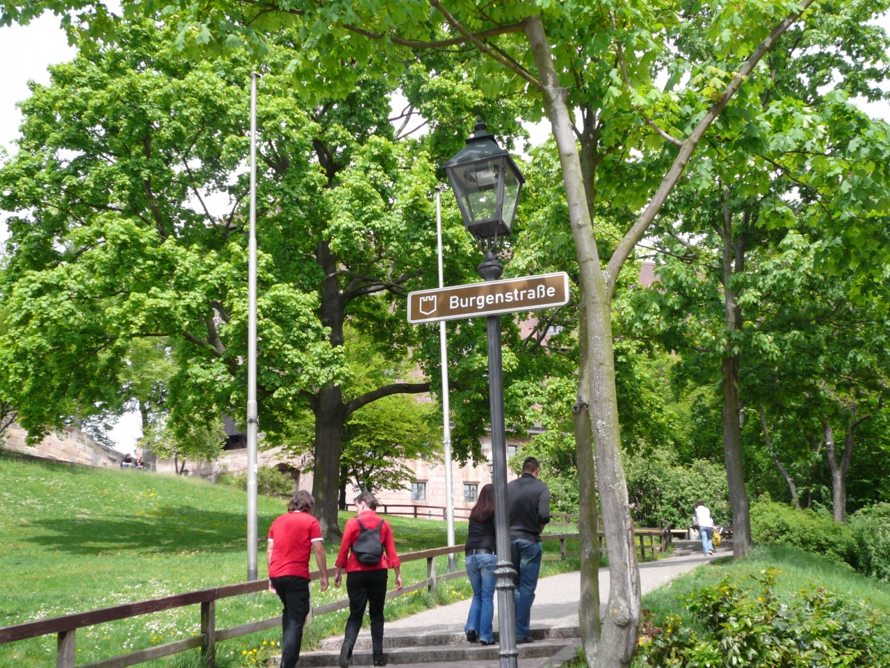 ニュルンベルク市博物館の横の道・Burgstrasse城の道をDie Burg Kaiserburgカイザーブルクに向かって上がる。薄紫のライラックが満開の様子を楽しみながら、上り坂を上がると、Burgenstrasse古城街道の標識が出てきた。