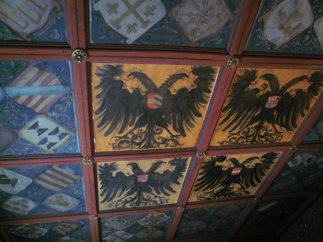 天井中央には、黄色の地に黒で双頭の鷲が描かれ、その他、王の様々な紋章が天井を隈なく覆い、圧巻である。だが、広い騎士の間は寒々としたもので、この城はあまり見るべきものが残されていないようだ。