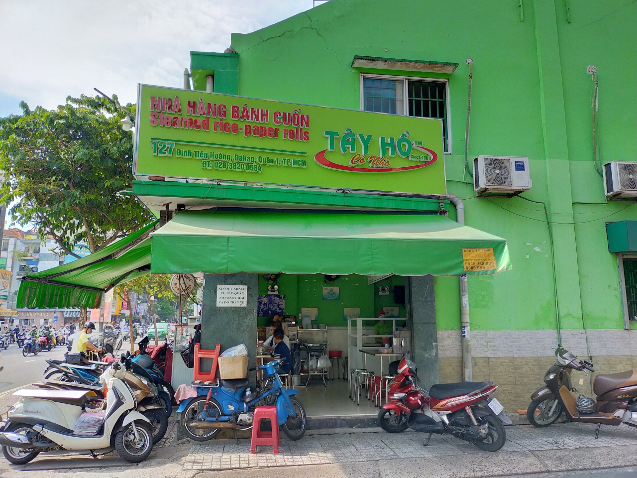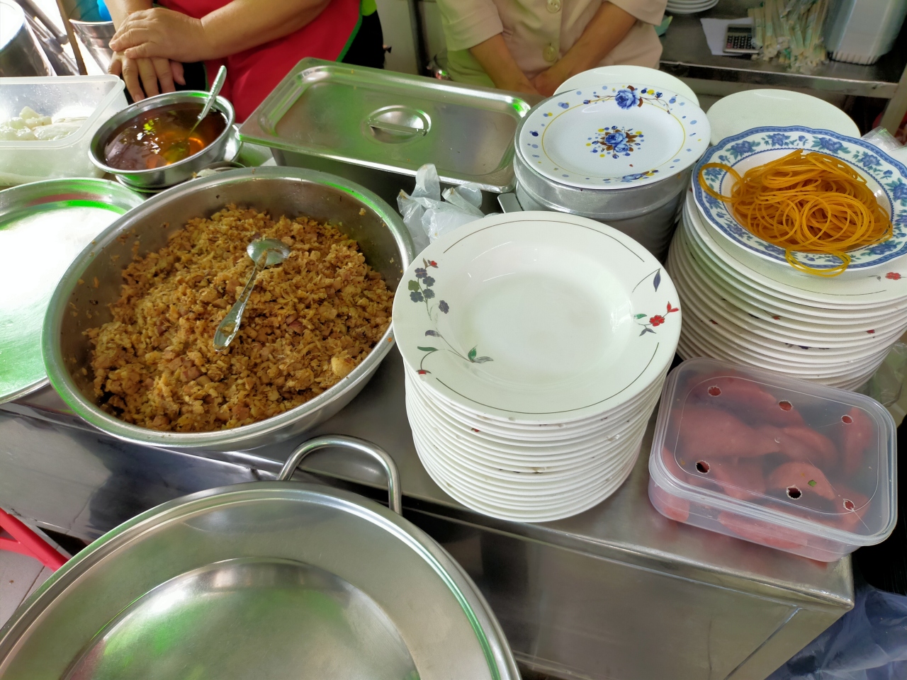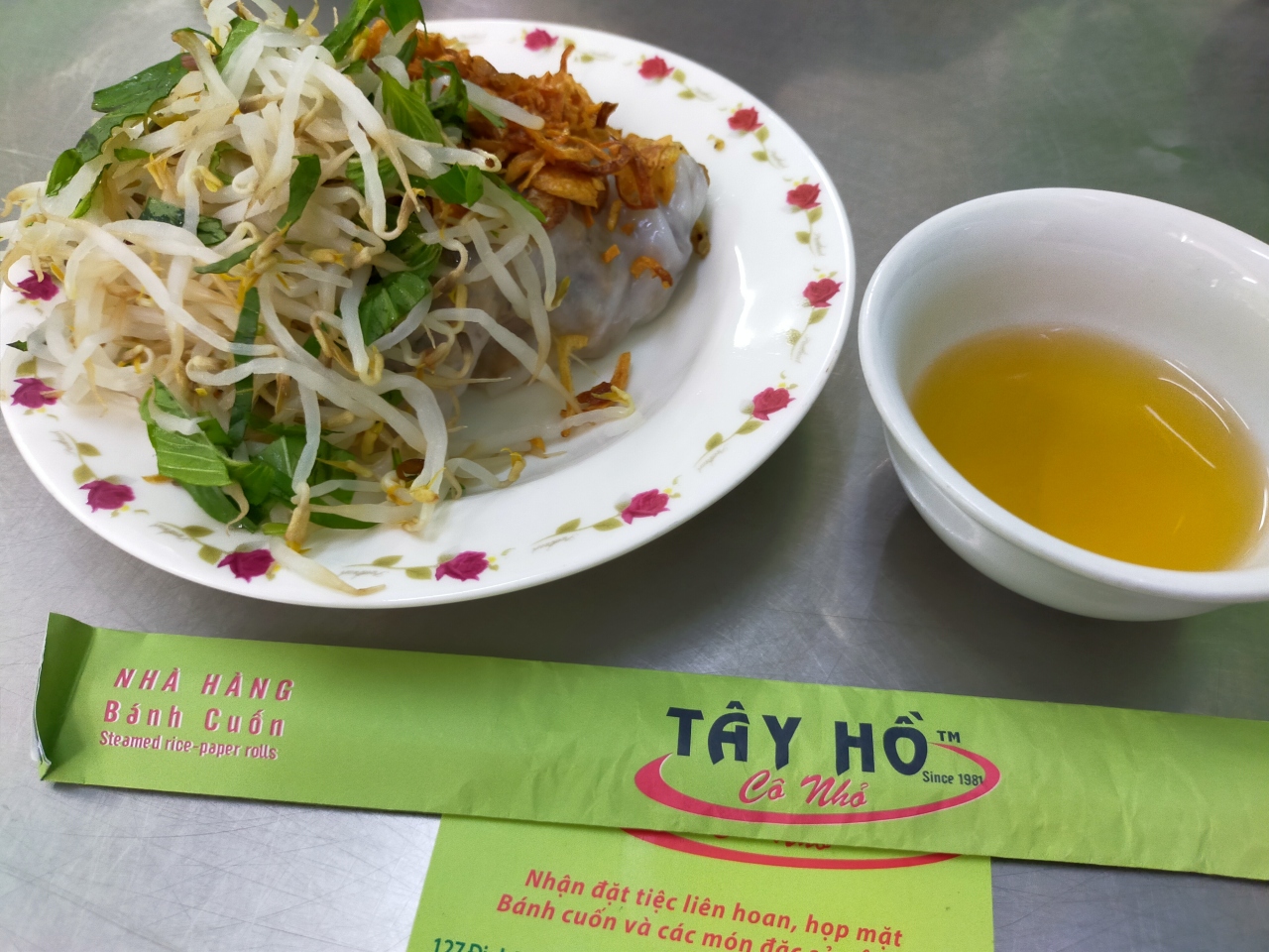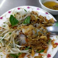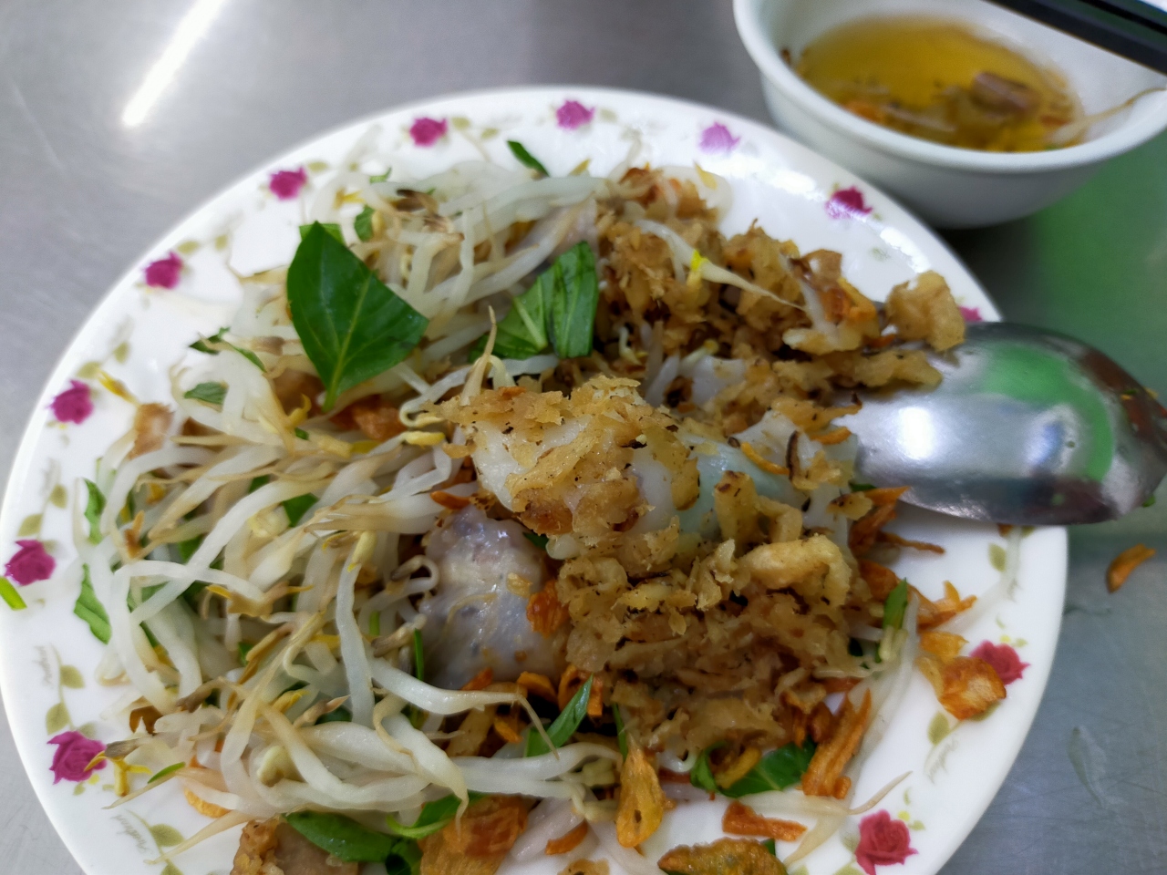 フライドオニオンや野菜がトッピングされていてヌックマムにつけて食べる家庭料理。