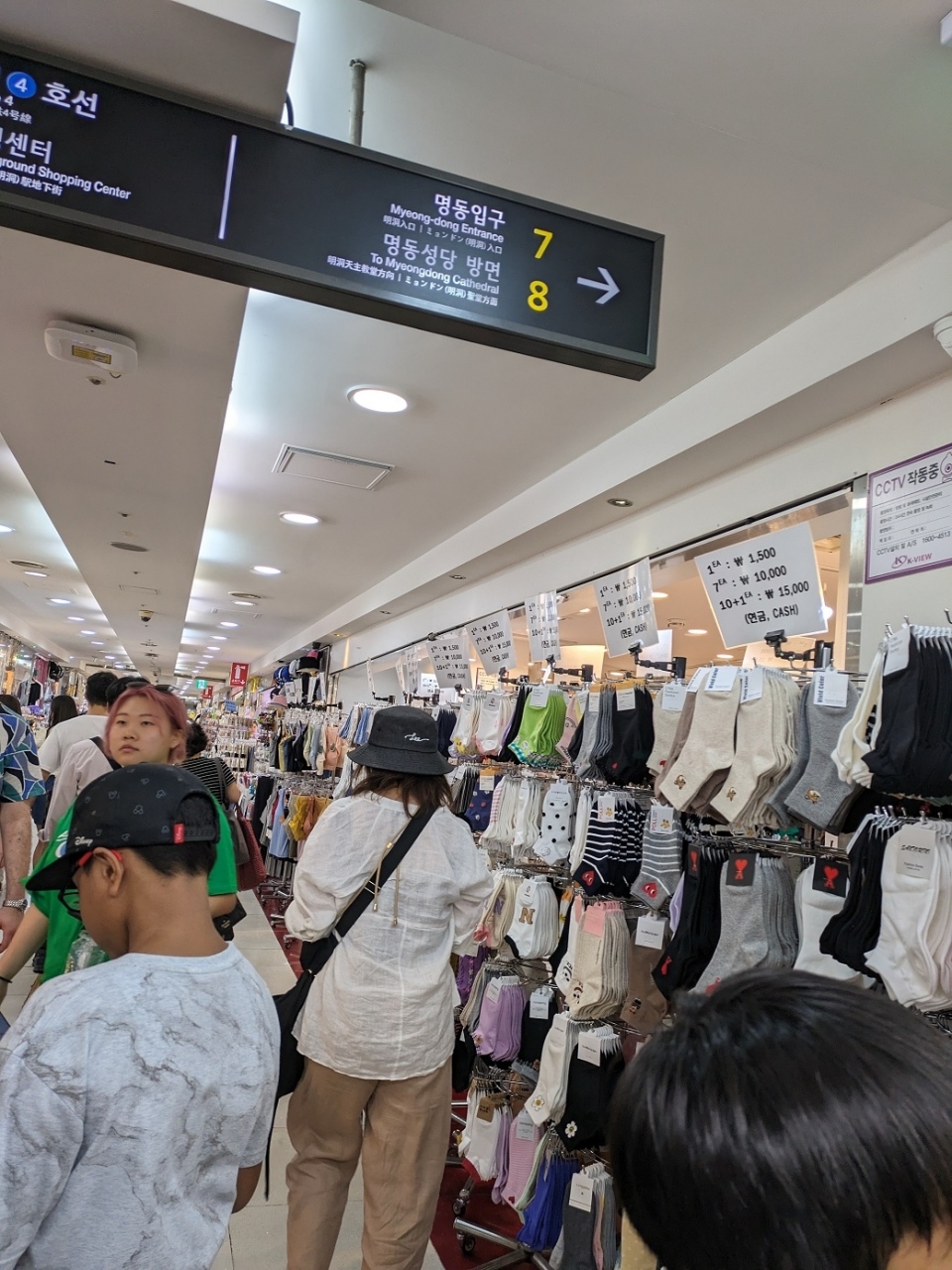 東大門や高速ターミナルには及びませんが、洋服など少し買い物する程度であれば十分です。靴下もたくさんありました。クレジットカードを使用できる店もありましたが、レシートのレートをみると現金のほうがお得です。