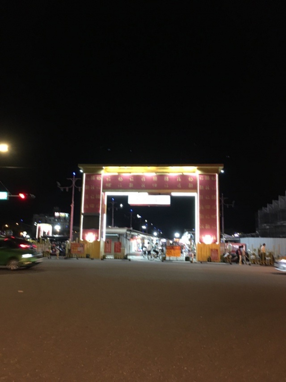 お店の大きさが、ほぼほぼ一緒で、お店のスペースに屋台みたいな感じで、碁盤の目みたいに並んでいます。どのお店もシャッターがついていて、シャッターが閉まると何のお店かわかりにくいのが難点です。夜市の門は、ライトの色が変わります