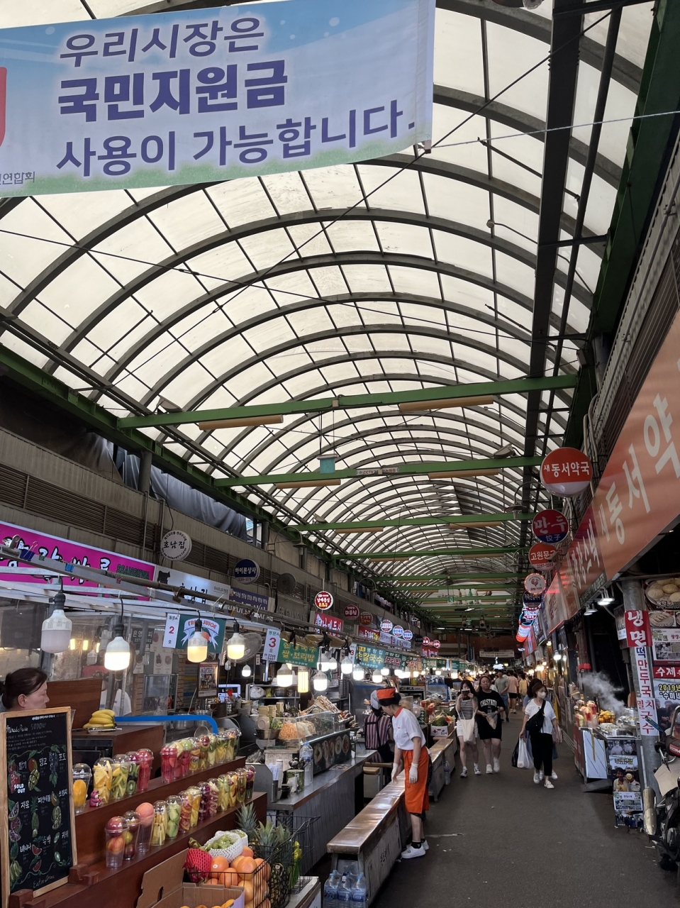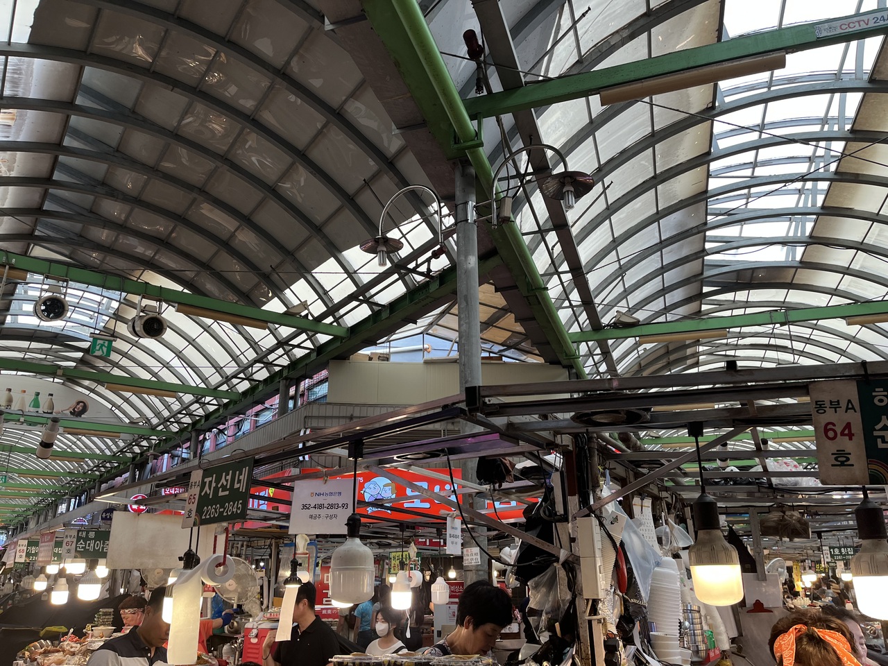 ユッケ通りもあり、日本では食べられなくなったレバ刺しを食べれるユッケ屋さんも何軒もあり韓国に行ったら必ず訪れる市場です。屋台飯はとっても有名な麻薬キンパなどもあり、おでんなどのお店など韓国風の色々な食べ物がありますが、明洞の屋台ほど映えるものを意識した感じではなく味で勝負という感じでした。
