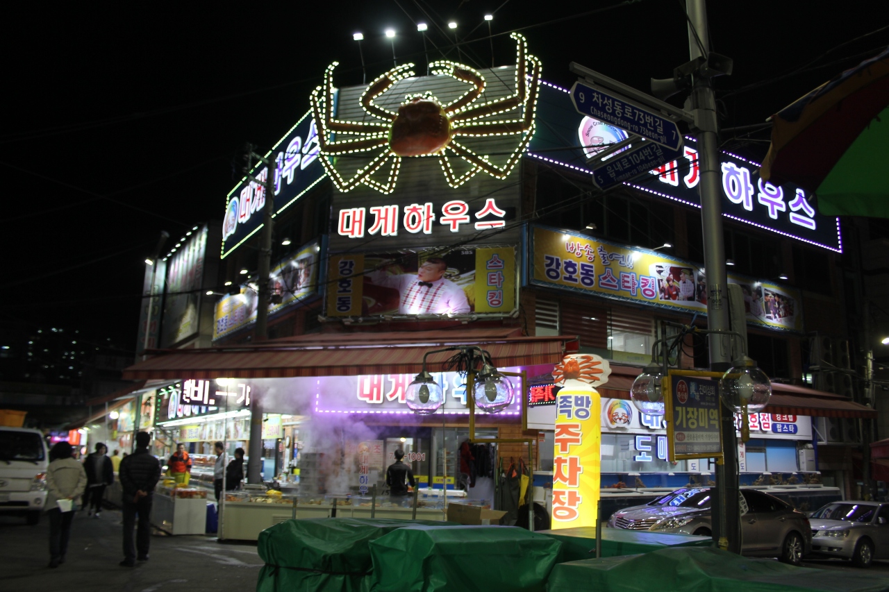釜山の郊外、釜田からの近郊電車や市内からバスでアクセスできます。かにをメインとした海鮮市場でいけす水槽にはたくさんのかにがつめこまれていました。周辺にはレストランも並び、かに料理がいただけます。安くはありません。