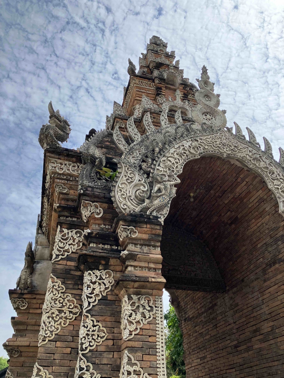 チェンマイの最大の観光地のドイステープを参詣し、ソンテウでチャーンプアック門に戻って来た時に、すぐ手前で立派なお寺が見えたので、ソンテウのベルを鳴らして途中下車しました。旧市街のお堀の北側の外側になります。ちょっと古めの木造の本堂の奥に大きな仏塔がありました。ちょっと変わったお寺だと思いました。入口の門が立派でした。