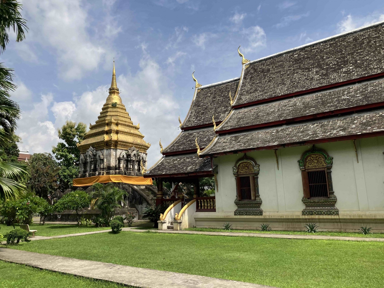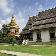 後で知りましたが、チェンマイで最も古いお寺だそうです。チェンマイはラーンナー・タイ王国が開いた古都ですが、13世紀に最初の王様が建てたお寺だそうです。建物の屋根の感じが素晴らしく、その後ろに建っている仏塔も見事なものでした。