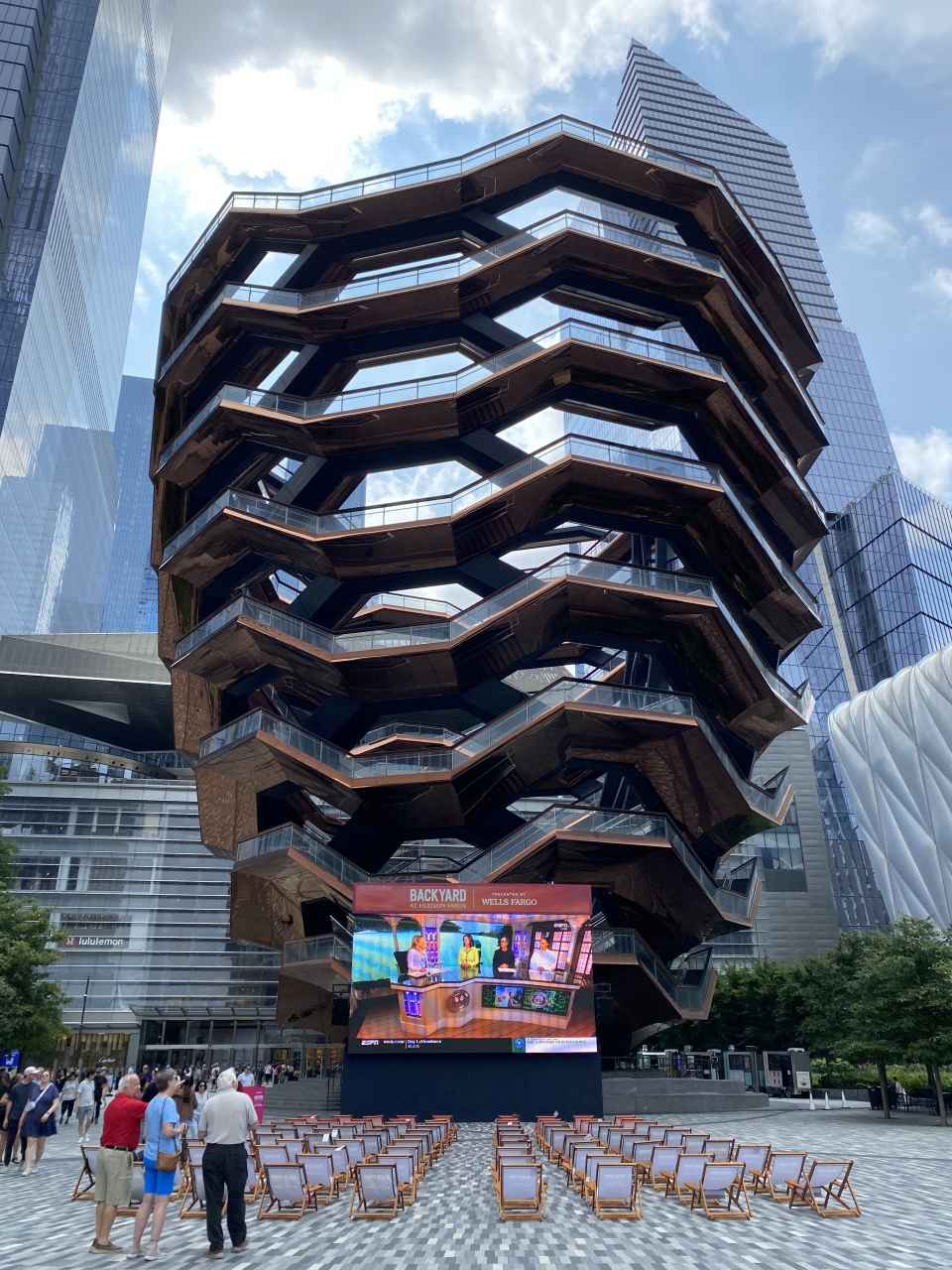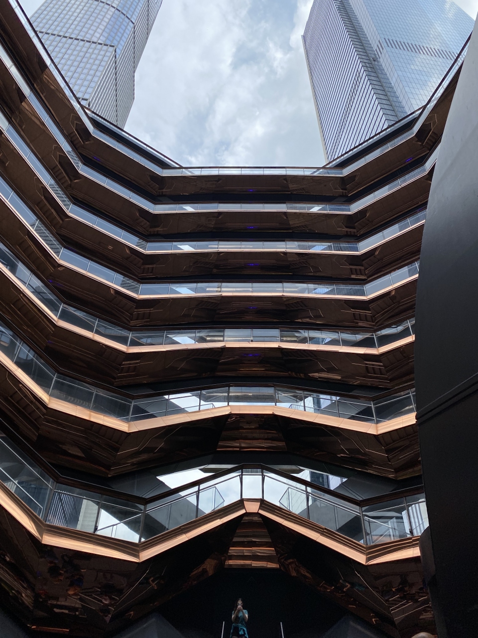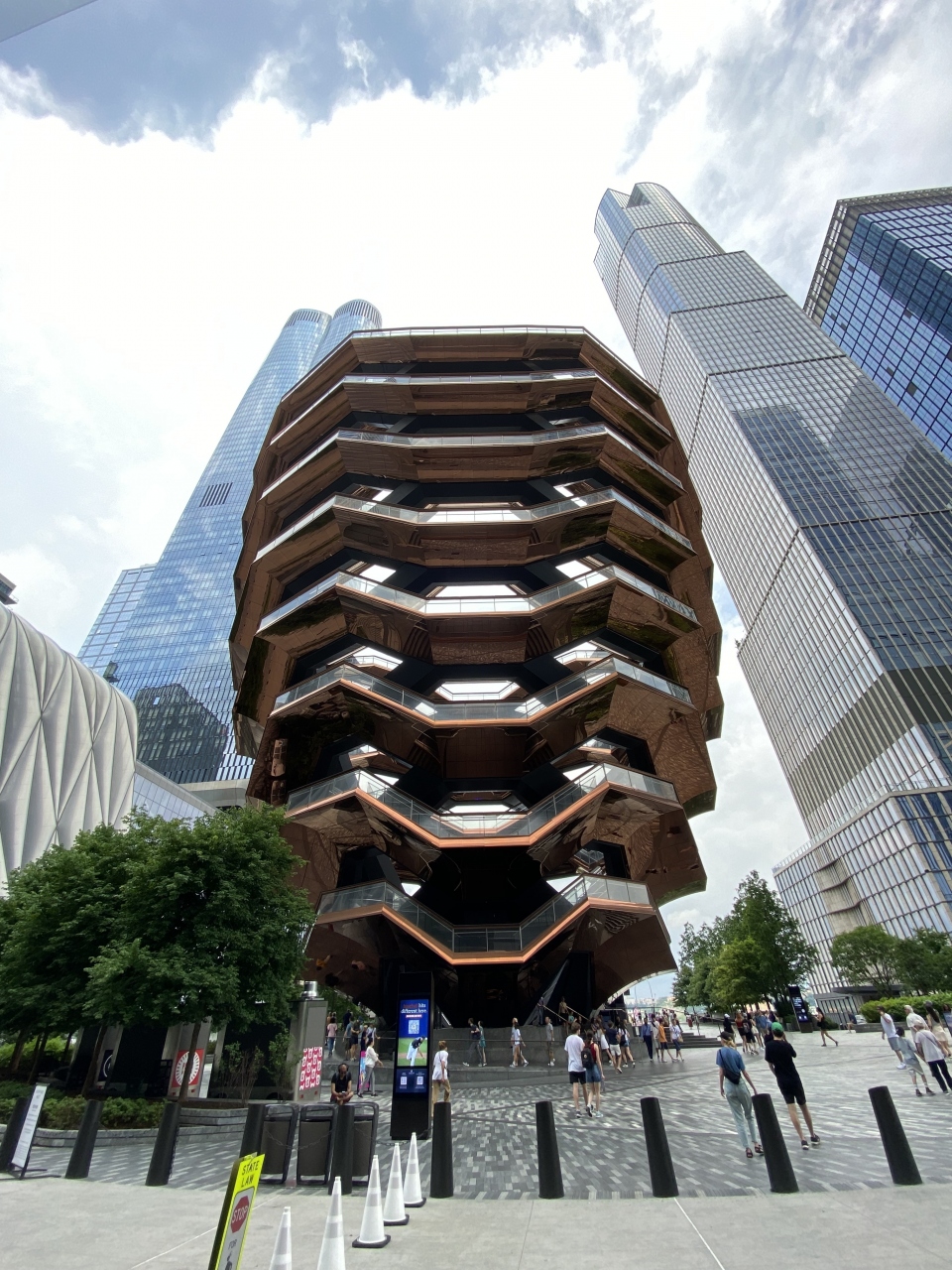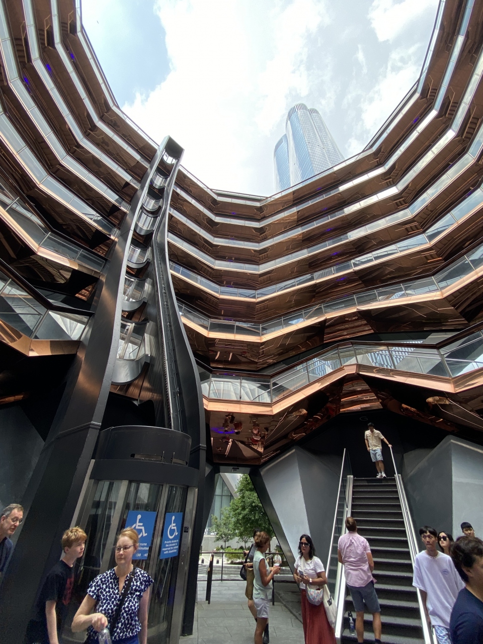 ハドソン・ヤードの中心に建つのが「ベッセル(Vessel)」、2020年2月にオープンした、英国人デザイナー、トーマス・ヘザウィック氏によって設計されたインスタレーションです。否が応でも目に入るこの奇抜な建築物は、ハドソン・ヤードのシンボルとして定着している様です。しかし、”階段と踊り場”だけで構成された賛否両論のあるデザインを持つこの建物は、オープンの2020年2月から2021年の7月までの僅かな期間で4人もの自殺者を出してしまい、閉鎖となってしまいました。確かに訪れた際は、無料で中には入れましたが上へは登れませんでした。また、しばらく中に居ると追い出されました。どうやら中に入れる時間帯は限られている様です。良くも悪くもマンハッタンの新名所なので、訪れておけば話のタネにはなるかと思います。