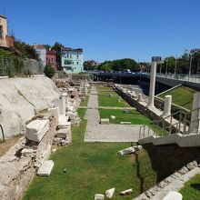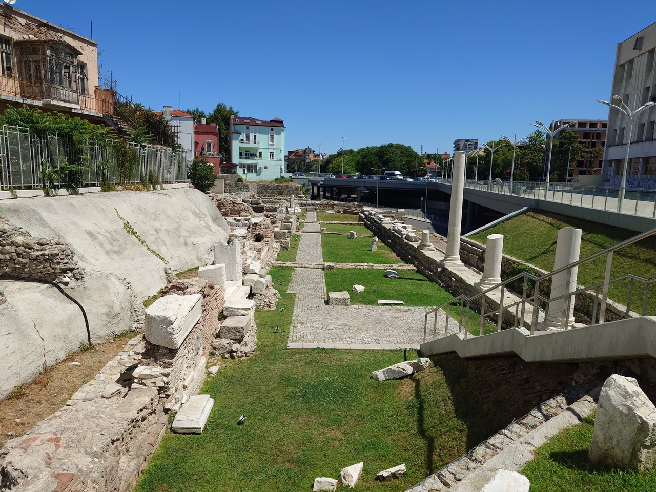 広くてきれいに整備された広場です。アレキサンダル・バテンベルグ通りに面しています。左右両側にローマ時代のフォーラムの遺跡があって、建物の跡やローマ時代の柱などを見ることができます。遺跡も整備されていて、手すりと階段で遺跡の中も歩くことができるようになってて、お得です。