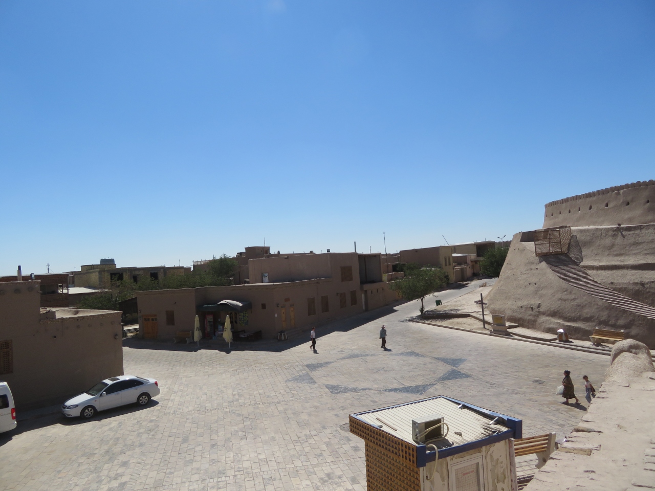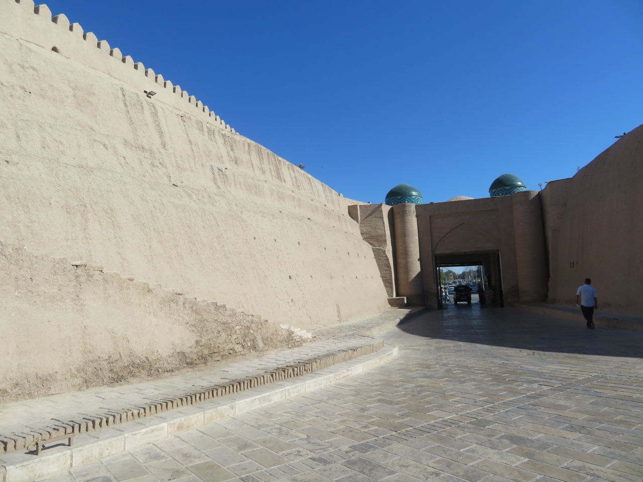 中世のヒヴァの町を囲む内側の壁です。町自体は小さく、イチャンカラ内で宿泊すれば十分見学できます。壁には4つの門があり、出入りするのは入場券が必要です。ただ、全ての門で入場券の確認をしているわけではないようでした。城壁の上を歩けないか、北門の近くで会談を上ってみましたが、途中で下ってしまいました・・・