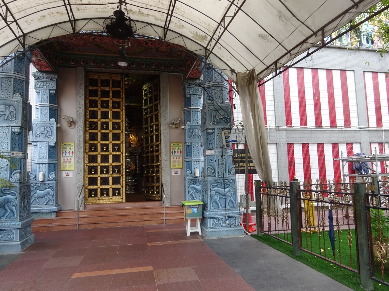 シンガポールのスリ・ヴィラマカリアマン寺院です。この寺院の周辺には、他にもいろいろな寺院やお寺がありあますが、こちらの寺院は他のインディア系の寺院より少し落ち着いたかんじがしました。彫像などに派手さが、それほど無いです。入り口なども重厚でいいかんじでした。
