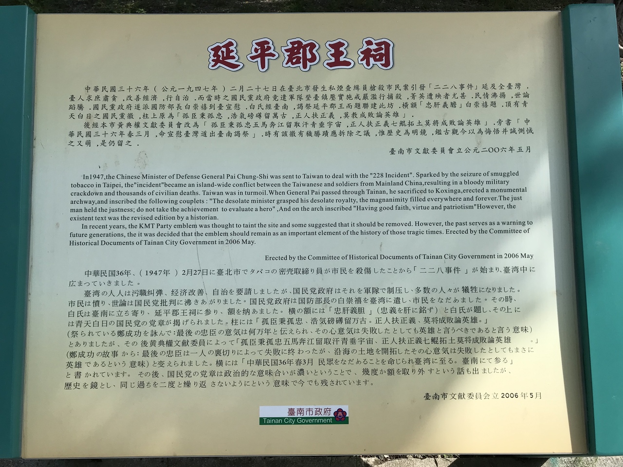 台湾を占領していたオランダ人を討ち払った鄭成功を祀る祠です。台湾独自の政権を打ち立てて台湾開発を促進する基礎を築いたので民族的ヒーローとされているそうです。