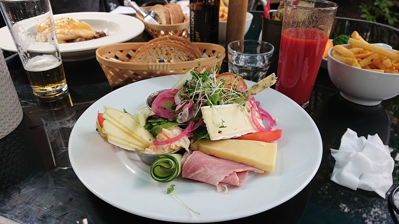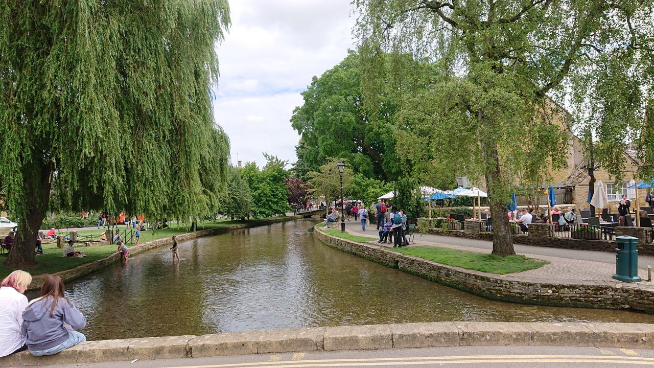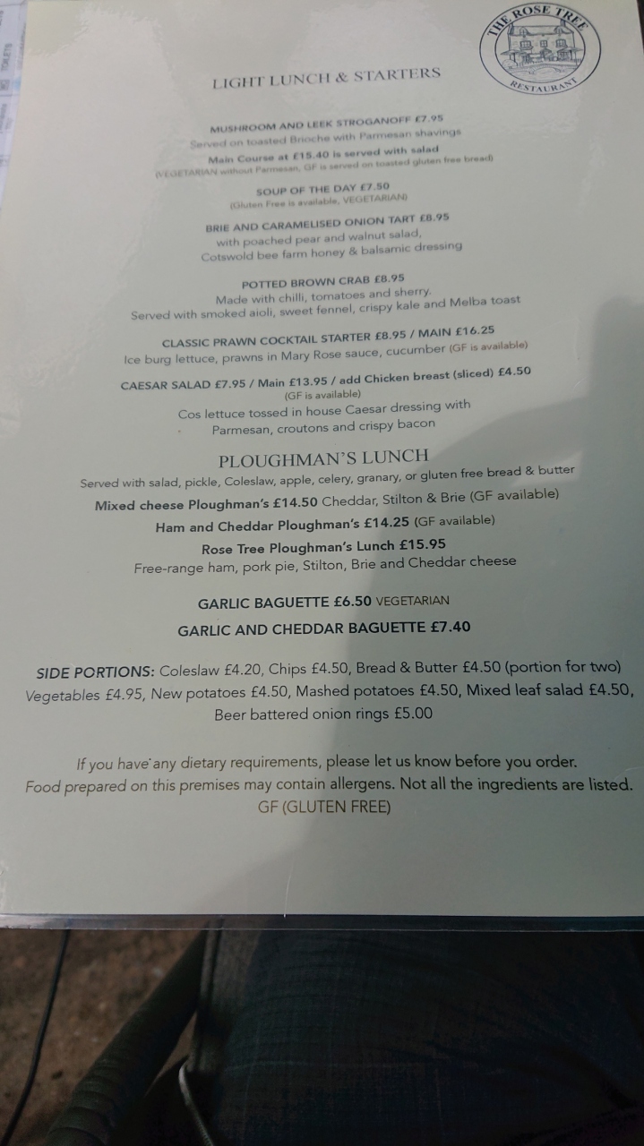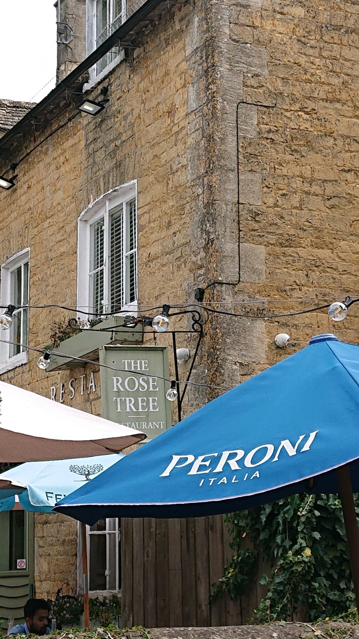 コッツウォルズ観光ツアー3番目のボートン・オン・ ザ・ウォーターで遅めのランチです。バスの車内で到着前に地図が配られました。10数件カフェ、レストランがありましたが、英国料理のレストランは2件。小川の近くは、この「ザ・ローズ・ツリー・レストラン」しかないので、ここに決めました。ツアーの方が来ると座れなくなるので、早歩きで来ました。外の小川に近い席が取れました。天気は良いし。パラソル付きのテーブルが気分を盛り上げてくれます。レストランに居ながらピクニック気分。従業員の方も、英語が不自由な自分な対し、親切、フレンドリー。飲み物は、家内はトマトジュース。イギリスに来て、トマトジュースがスーパー、レストランで無くて困ってました。とても美味しかったそうです。自分は、旅の記念に地元のビール。お薦めのホークストーンプレミアムビールを。飲みやすかった。美味しかった。料理は、家内はイギリスで有名な「プラウマンズ・ランチ」(農夫の昼食、これを食べれば、午後もしっかり働ける)を。このレストランでは、3種類有りました。基本は、サラダ、ピクルス、コールスロー、リンゴ、セロリ、全粒粉のパン、バターです。これにメインによって値段が変わります。ハムとチェダーチーズのプラウマンズ・ランチ 14.25£。3種類のチーズ(チェダー、スティルトン、ブリー)のプラウマンズ・ランチ 14.5£。レストランの名前の付いたローズツリープラウマンズ・ランチが15.95£。家内はローズツリープレグマンズランチにしました。先程の基本にハム、ポークパイと3種類のチーズ(チェダー、スティルトン、ブリー)が付いて来ました。盛り付けもとてもお洒落。家内も美味しいと喜んでおりました。自分は、ステーキマッシュルームキドニーパイ(腎臓肉のパイ)独特の香辛料、ハーブが感じられます。少し癖が有ります。完食しました。何故か、一匹の大きなハエがキドニーパイに飛んできます。独特の匂いがするのでしょう。左手でハエを払いながら、右手でフォークで食べる感じです。お腹一杯。メニューを写真で撮影してきたのですが、今思うと、デザートも食べたかった。でもお腹一杯。集合時刻も間近。慌てて、写真撮影しながら、集合場所に戻ってきました。BS141 8/25(金)22時30分から放映されたハンカチ王子の斎藤選手がコッツウォルズの別の村でやはり「プラウマンズ・ランチ」を食べてました。皆様もボートン・オン・ ザ・ウォーターに行かれた際は、天気のよい日は「ザ・ローズ・ツリー・レストラン」の外の席で優雅なランチは如何でしょうか?