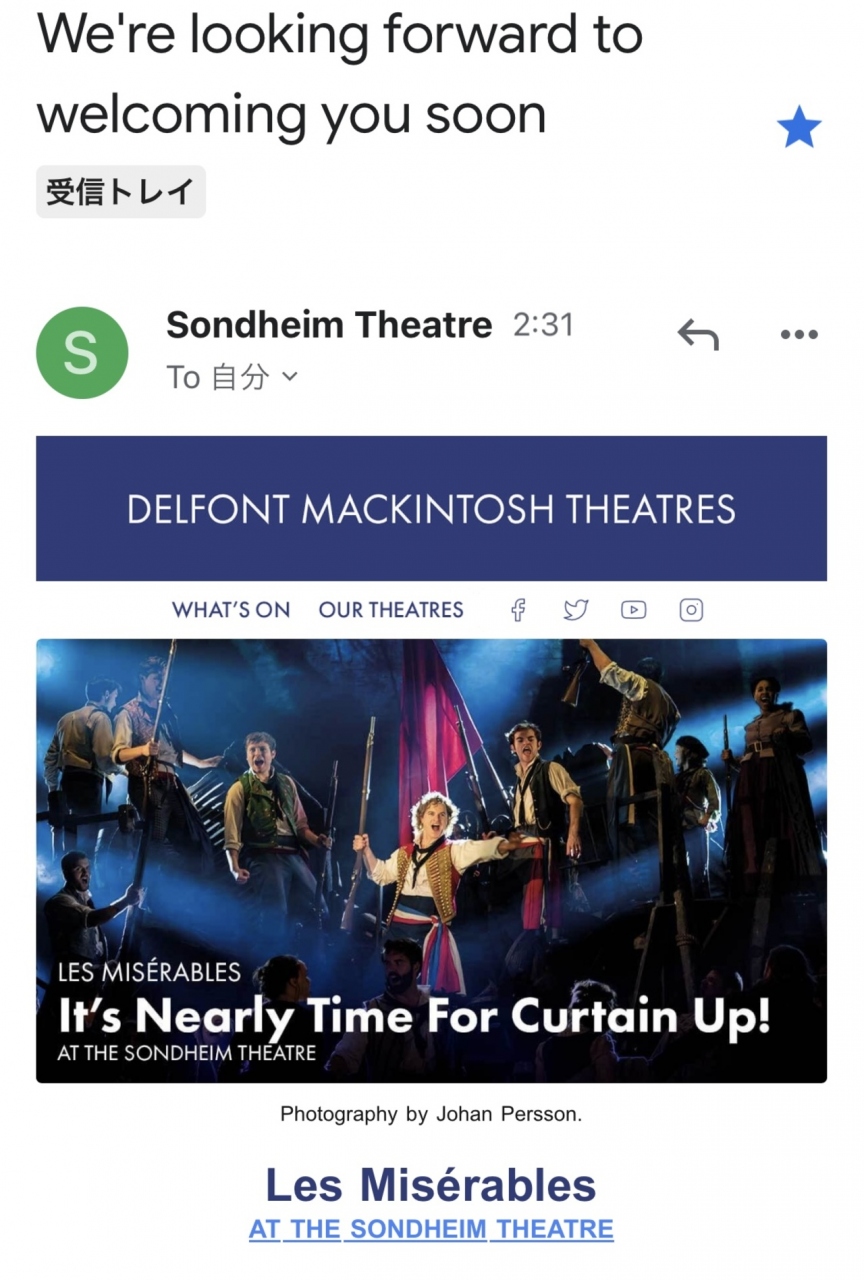 レミゼ 公式HPからチケットを購入。決済後すぐにeチケットが添付されたメールが届いて、当日はeチケットのバーコードを提示することで入場できました。6列目の中央席で鑑賞。ロンドンの劇場はロビーでお酒やおつまみを販売していて座席で飲食することができるのですが、たまたま後ろの席の家族がずっとお菓子をポリポリ食べていて、静かに歌を聴かせる場面でも「ポリポリぽりぽり‥」と音が聞こえてかなり幻滅でした。まあこれも運です。
