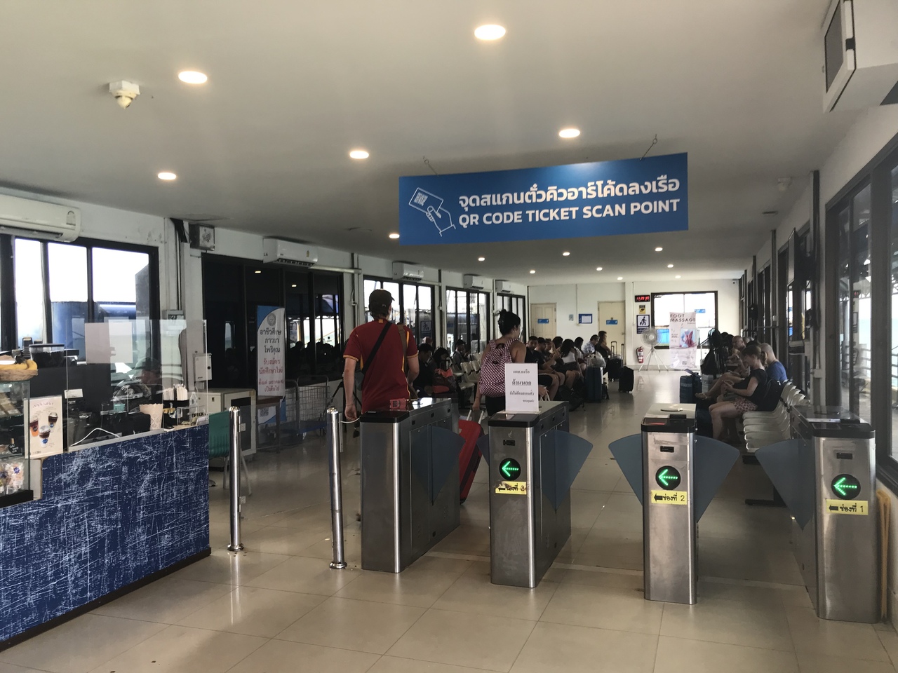 遠浅の海なので、陸地より突き出た長い桟橋の先端にフェリーが接岸します。フェリーのチケット窓口や乗船までの待合室も、桟橋の先端部にあります。