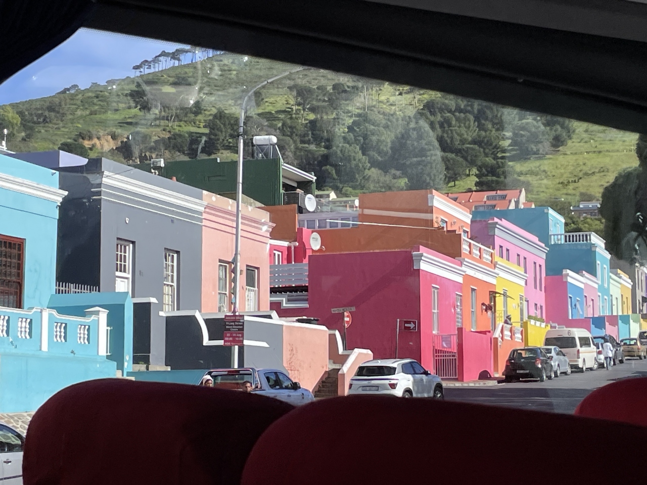 ケープタウン中心部に近い、イスラム教徒の方たちが多く住んでいる地域です。パステルのかわいらしい家が並んで、メルヘンの世界のようですが、バスが停められないことと、治安が今一つ良くないとのことで下車することは出来ず、車窓観光のみでした。