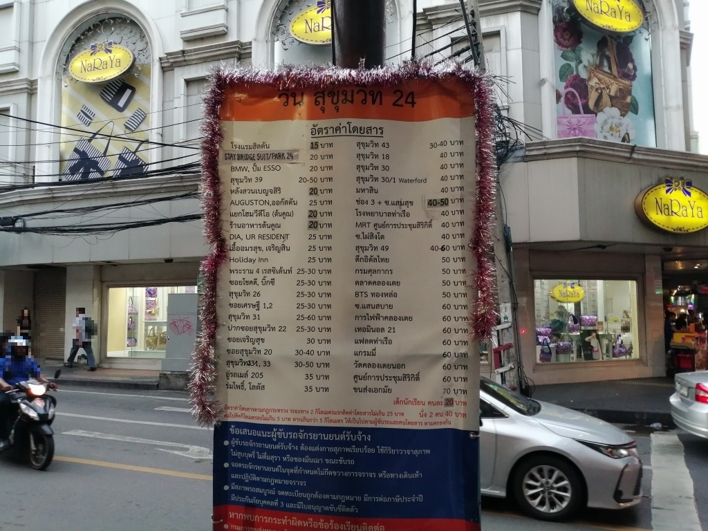 ほとんどの乗り場には、行き先ごとの料金が書かれたタイ語の看板があり、料金をぼられることはほとんどありません。
