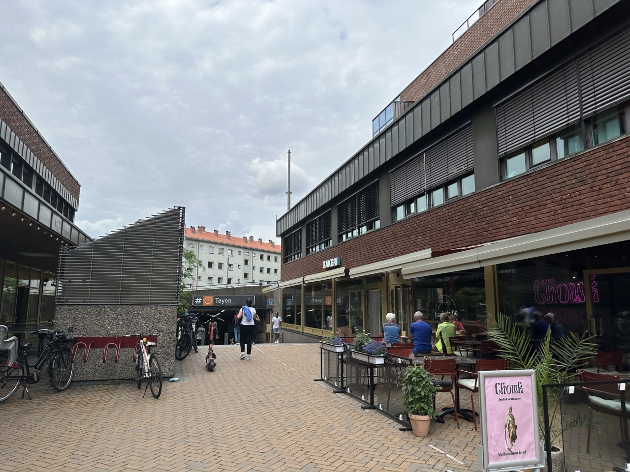 トーエン駅は、オスロ中央駅(ヤーンバーネトルゲ駅)から地下鉄T-Baneで2駅、4分のところにあり、地下鉄の4つの路線が乗り入れています。オスロの中心街の近くですが、駅前は静かで落ち着いた雰囲気で、地下鉄から地上に出たところにはベーカリーやカフェが入ったおしゃれな建物があります。