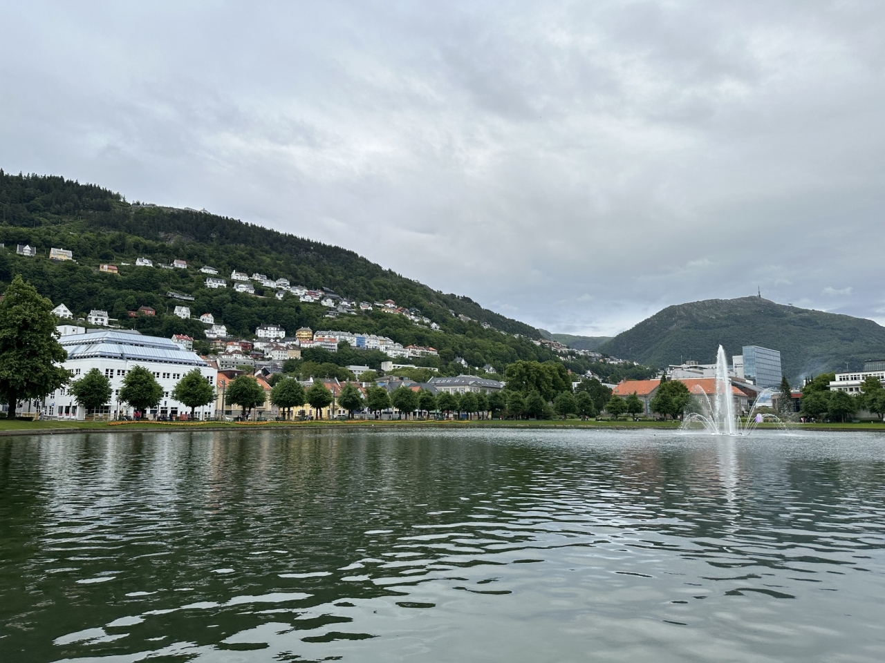 ベルゲン中央駅から歩いて1分のところ、1周約500mの花に囲まれた8角形の池が、小ルンゲゴース湖です。池の中心には噴水があり、周囲は遊歩道が整備されています。遊歩道は、花や池を眺めながら散歩をする人、ジョギングをする人、ベンチで休む人などで賑わっています。