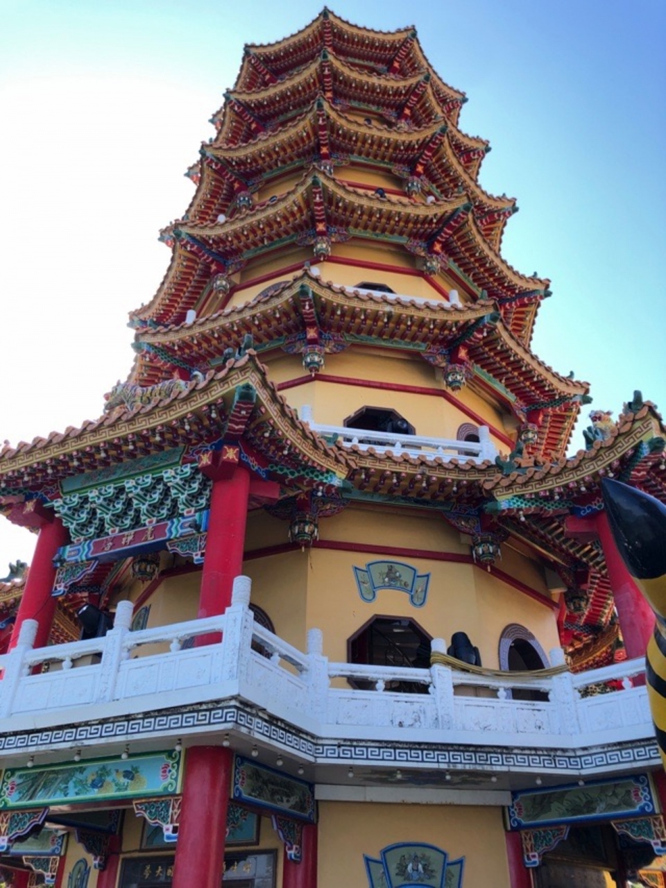 外観がものすごいチャイナな何層にも上にのびていて、原色を大量に使用しています。それだけでなく、2つの塔の中の作りも、チャイナの雰囲気満載で、技術力も高く、とても惹かれました。周りは湖で、風が強いので気をつけてください。