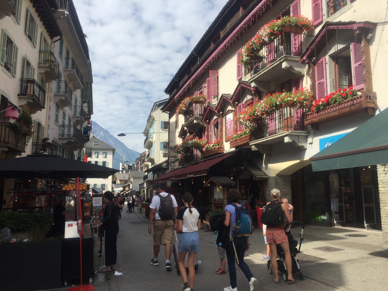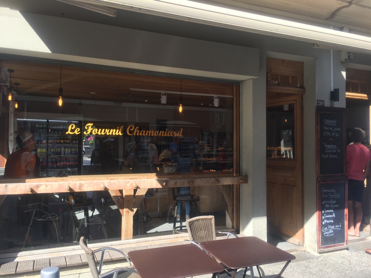 モンタベール鉄道からホテルに帰るのにシャモニーの街歩きをするため遠回りしました。山から降りてきたせいか、山岳の街にしては暑いです。観光客もけっこういました。エギュイデミディ通りをホテルに向かっていたら、美味しそうなパン屋があったので、夕飯を購入。美味しかったので 翌日 昼食を買いに行ったらすごく並んでいました。
