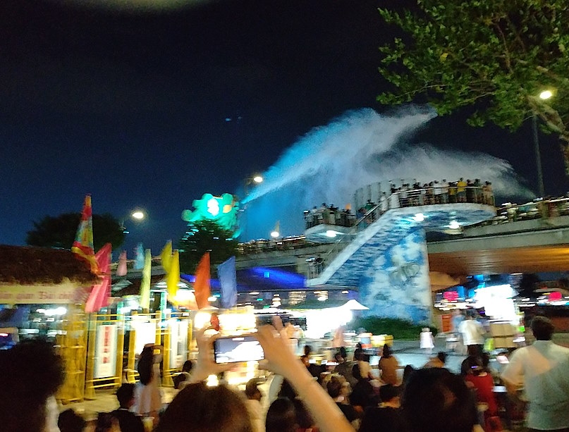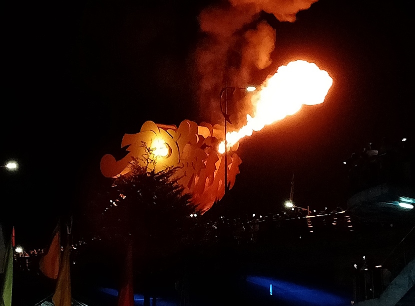 土曜、日曜の夜9時から、ドラゴンが火を吹いてくれます。その後、水も吹き出すのですが、風向きによっては自分のいる方に水しぶきが飛んでくるので、ご注意ください。