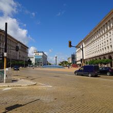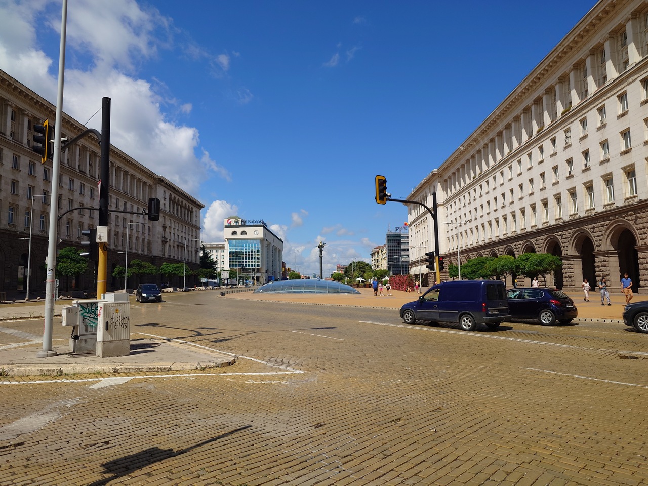 ソフィア中心部、聖ソフィア像が立ち、旧共産党本部の重厚感ある建物が突き当りになる通りです。ここは車道幅が広くて、横断するには地下通路を利用しないといけません。地下通路には複数の天窓?が設置されていて、そこまで暗い雰囲気ではありません。人は多いです。