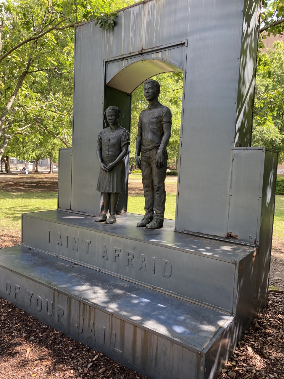 ”刑務所なんて恐れない”と書かれた像...公園内に円形に造られた散歩道「フリーダム・ウォーク」に沿って、公民権運動の軌跡が残されています。