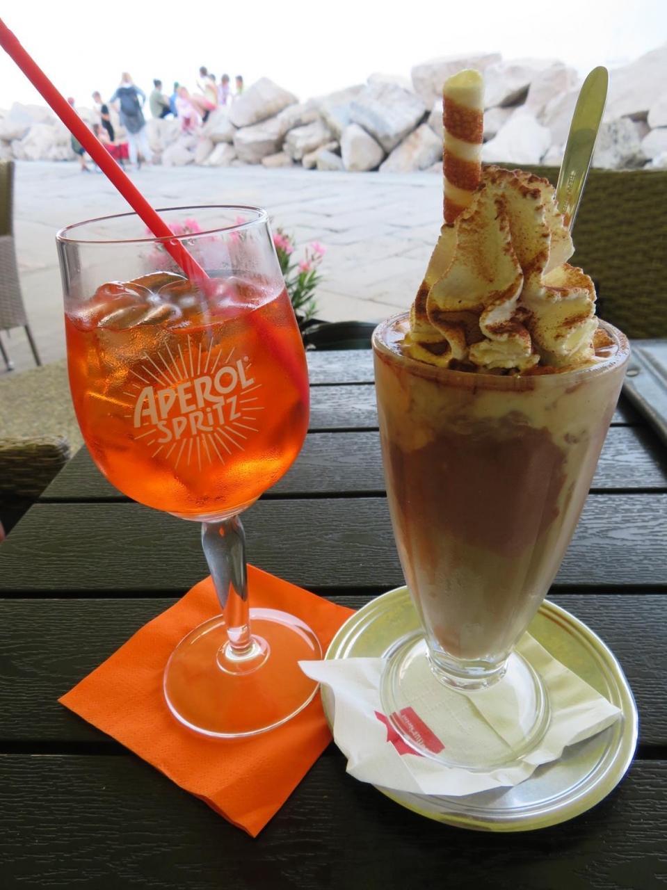 私たちは、夕焼け色のアペロールスピリッツと、バニラアイスと生クリームたっぷりのアイス・コーヒーにしてみました。